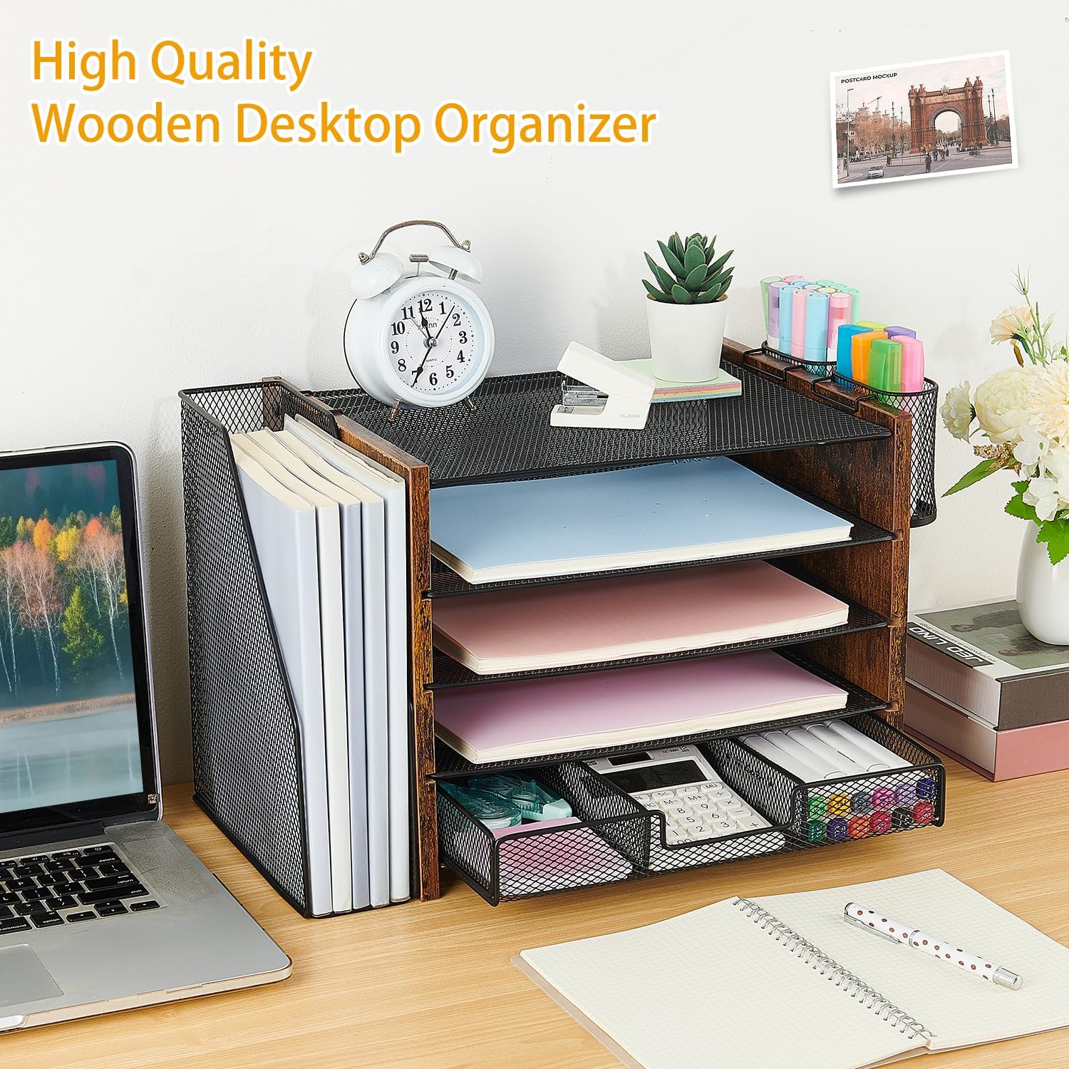 Wood Desk Organizers and Accessories with File Organizer, 5-Tier Paper Organizer with Drawer & Pen Holder, Office Desk Accessories, Workspace Desktop Storage for Office Supplies Organization(Brown)