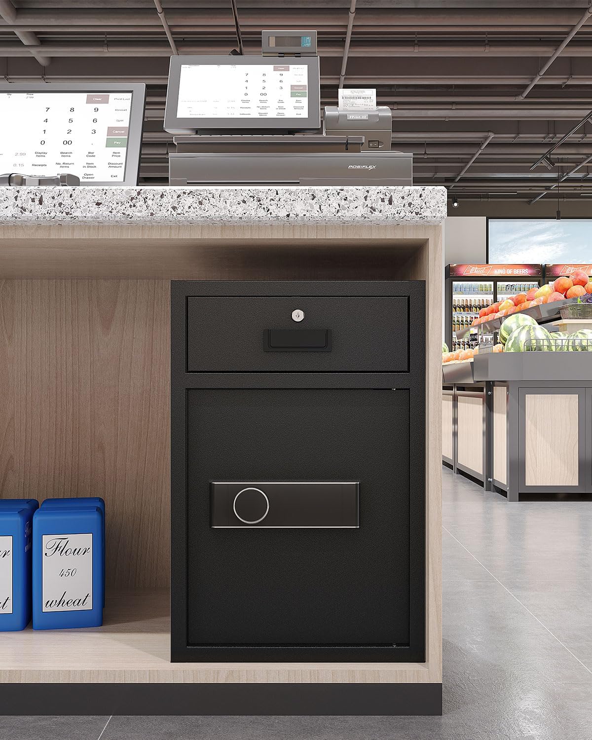 - 【Secure Cash Management for Businesses】 Designed for hotels, retail stores, cafes, and offices, this safe features a dedicated drawer for quick employee access and dual control (password/key) for managers. Prevent internal theft while securely storing cash, checks, receipts, and documents.