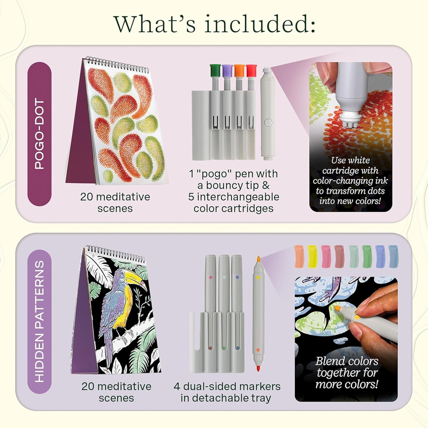 - Hidden Patterns, Animals: Color in each section to reveal hidden patterns and shading, adding captivating detail to the scene. Marker inks are mixable so you can layer one color over another to create a new color. Watch beautiful scenes unfold before your eyes!