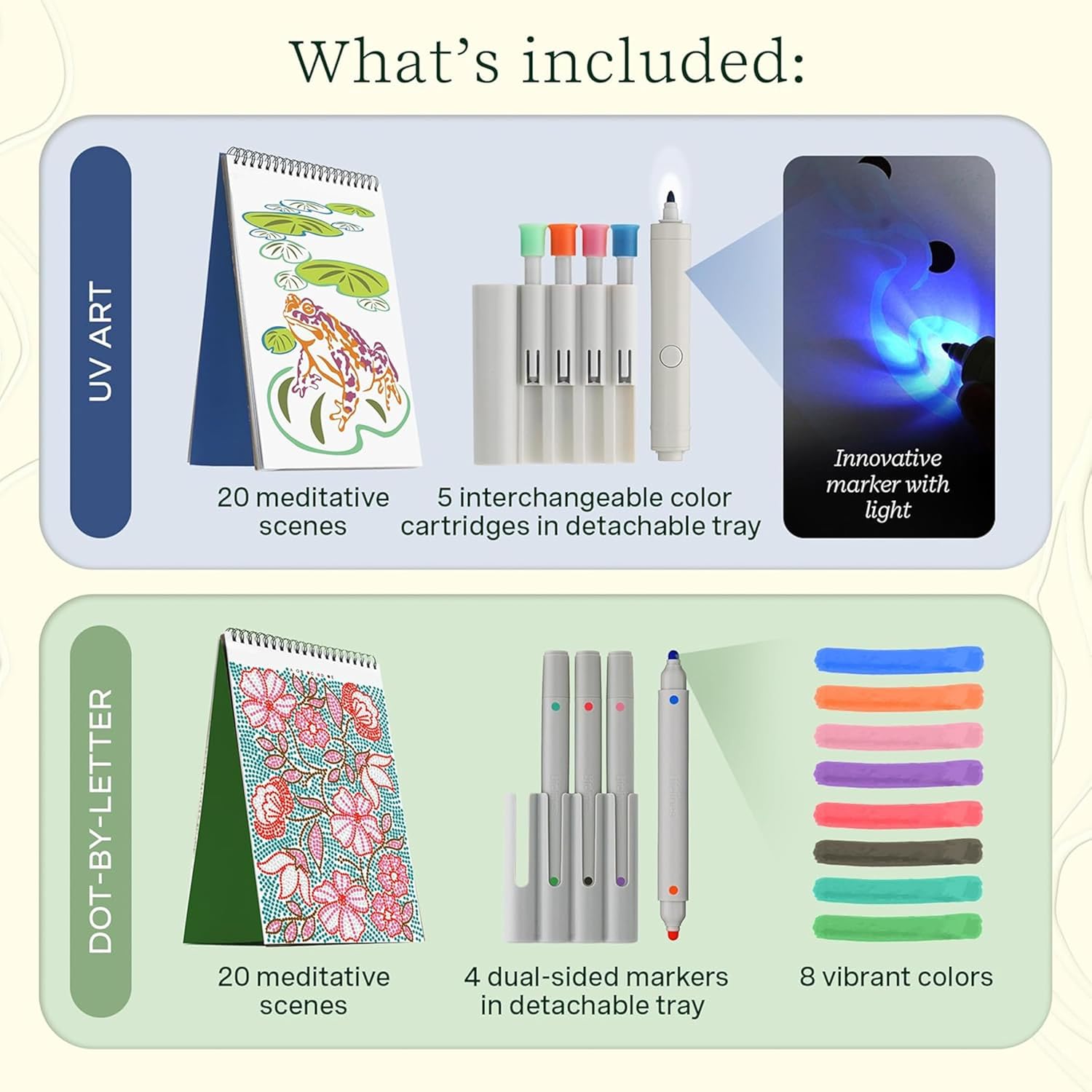 - PATENT PENDING, INNOVATIVE ACTIVITY PADS: Get into a calming flow state. This Lifelines FlowArt 4-Pack includes Dot-By-Letter, Hidden Patterns, Pogo-Dot, and UV Art activity pads. Each pad includes 20 meditative scenes and a set of unique markers in a detachable storage tray.