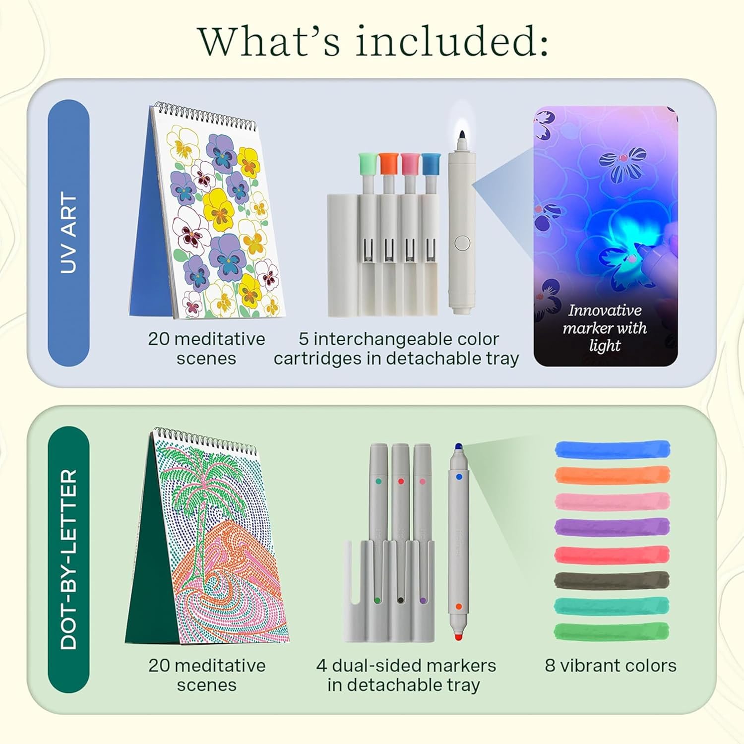 - UV Art, Foliage & Flowers: Experience full immersion into this mesmerizing activity by hovering the marker light over the page to reveal hidden, traceable scenes. Includes innovative illuminating marker and 5 interchangeable colors. Marker inks are mixable so you can also create new colors!