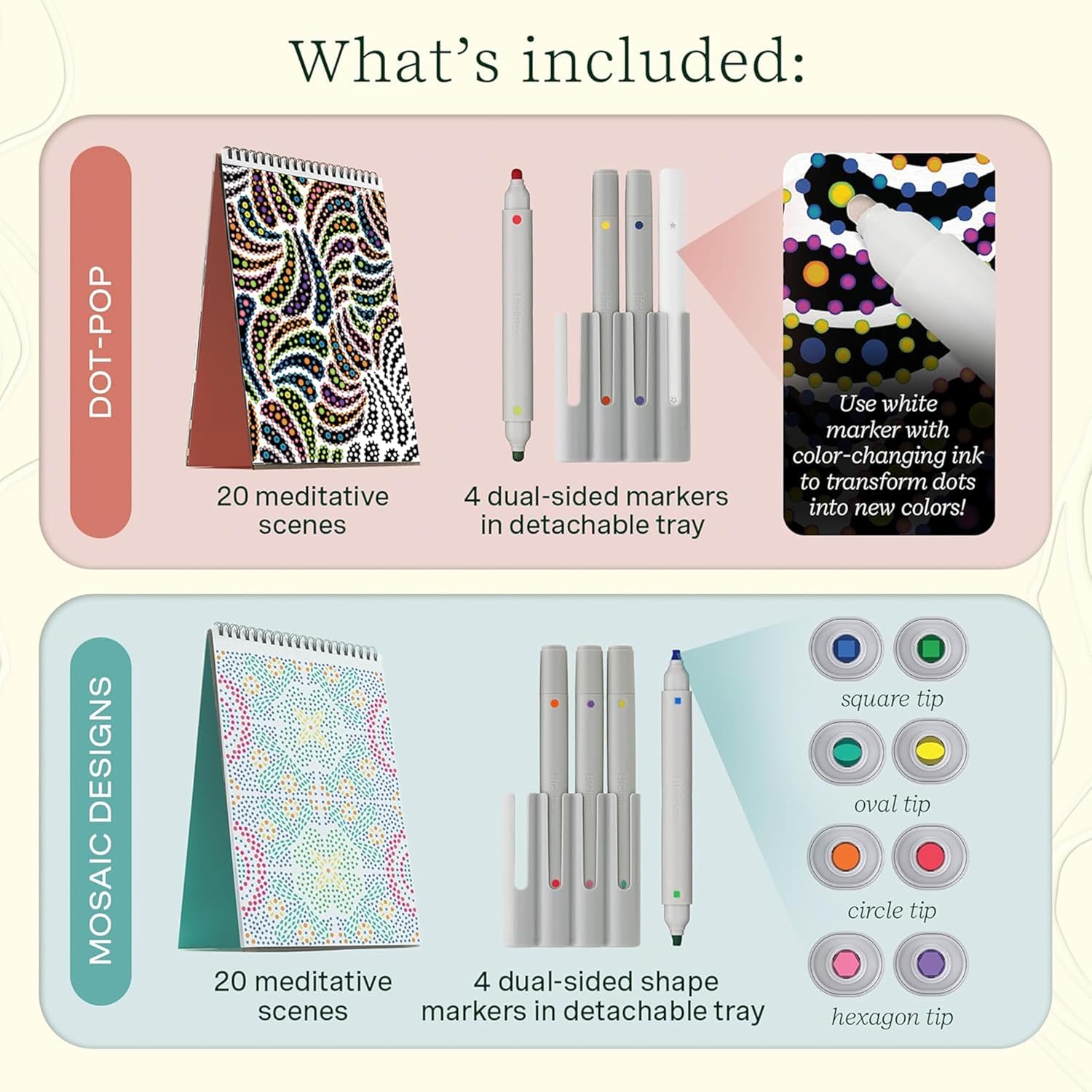 - Dot-Pop, Natural Flow: Use the special dot markers to fill in the empty spaces with dots to create an amazingly colorful scene. Then, use the white marker with color-changing ink to transform dots into new colors!