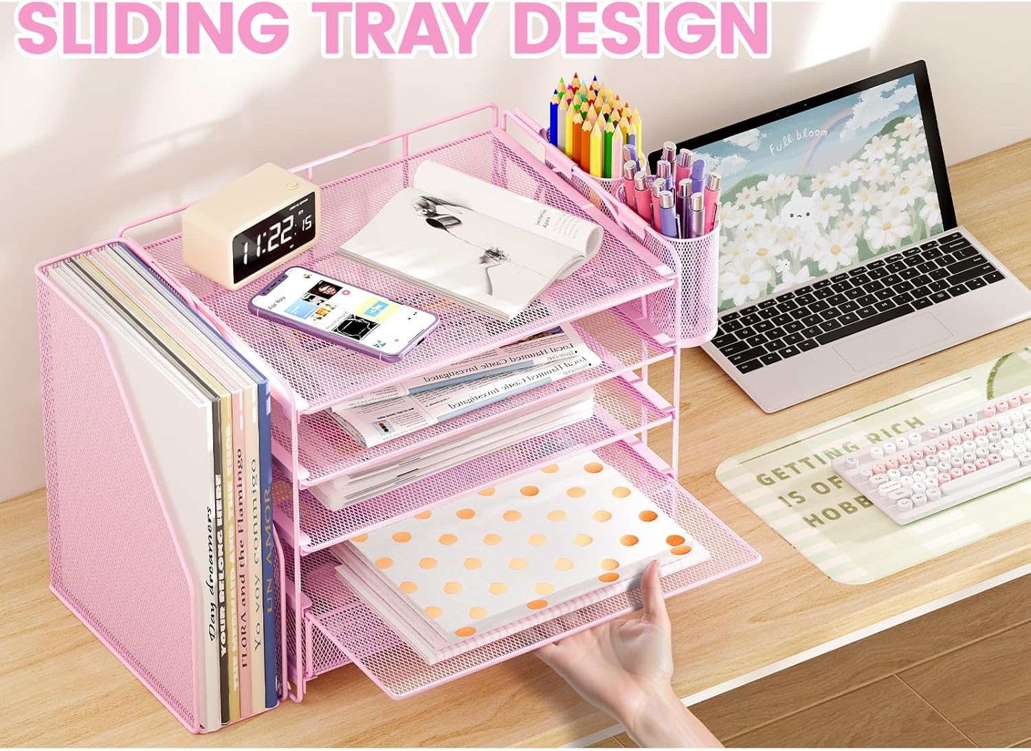 Desk Organizers and Accessories, 5-Tier Paper File Organizer with Drawer & Pen Holder, Office Desk Accessories Workspace Desktop Organizer for Office Supplies((Pink)