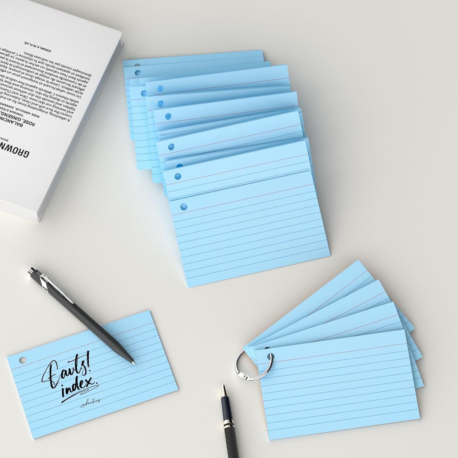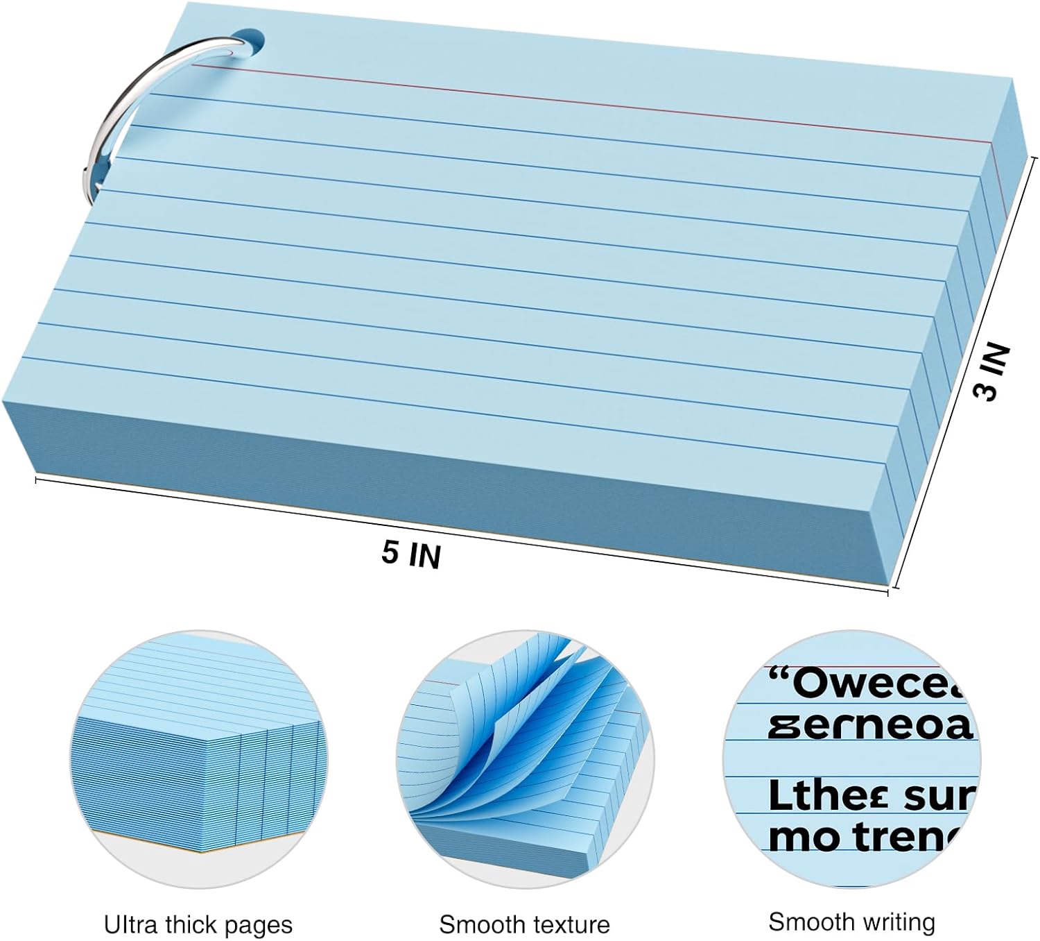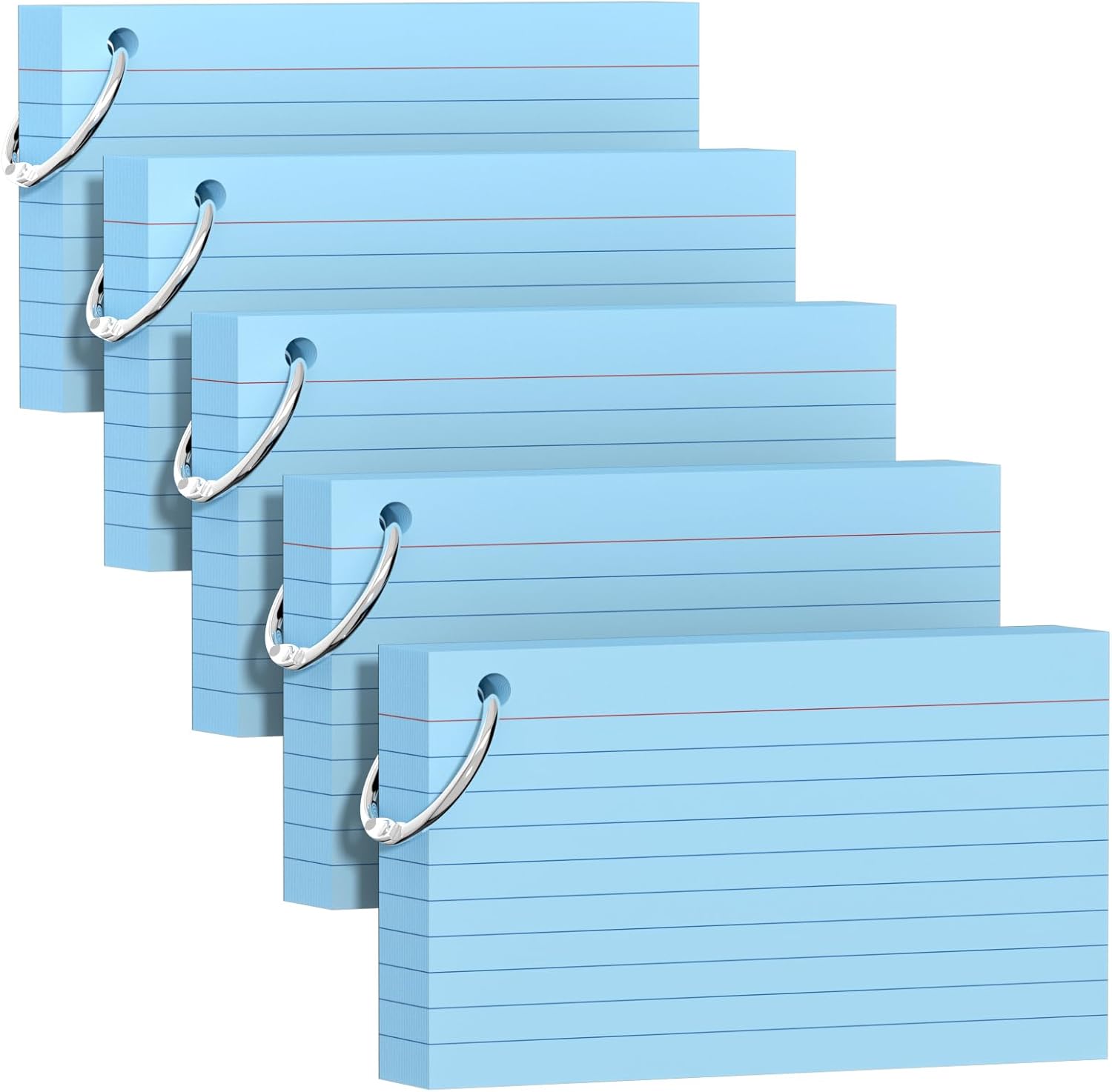 250 Count Blue Index Cards 3x5 Inch with Key Ring, Color Flash Index Card (50 Sheets Each), Durable & Portable Note Taking for Students, Teachers, Study Note Cards for Office Home School