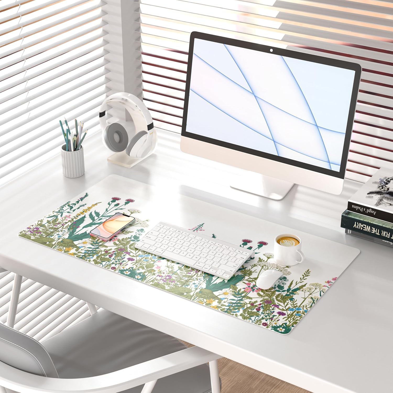QIYI Large Mouse Pad, Floral Desk Mat for Desktop, Wildflowers Herbs PU Leather Waterproof Gaming Mousepad, Computer Laptop Desk Accessories Protector Writing Pads for School Office Home 31.5" x 15.7"
