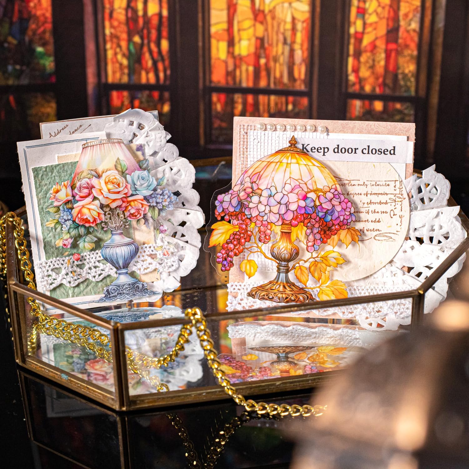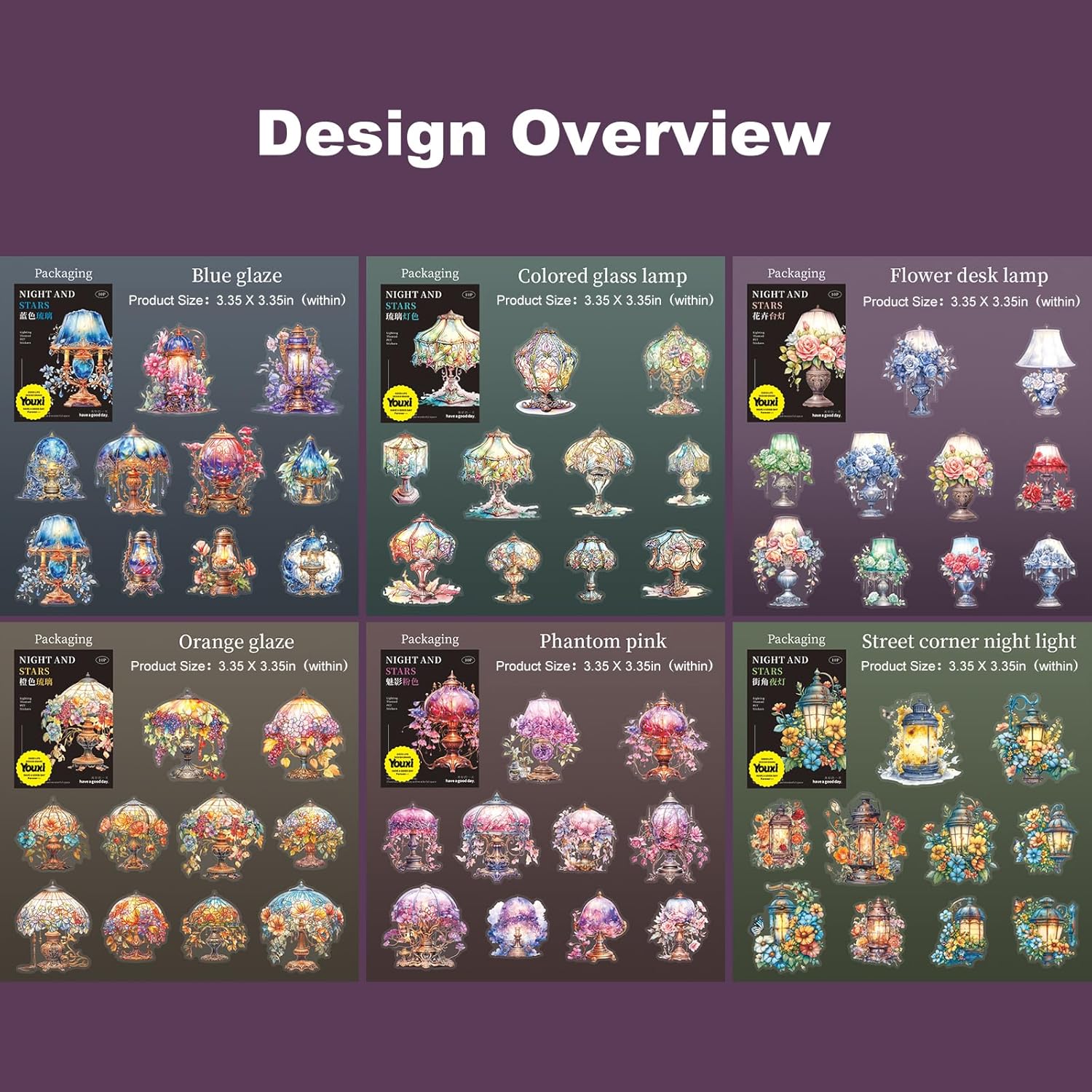 - Elegant Lighting-Themed Designs: This set includes 60 PET stickers featuring intricate vintage lamp designs, inspired by classic stained glass, floral lanterns, and antique lampshades. Each sticker set contains 6 styles, with 10 unique designs per style, making it a stunning addition to your scrapbooking and journaling collection