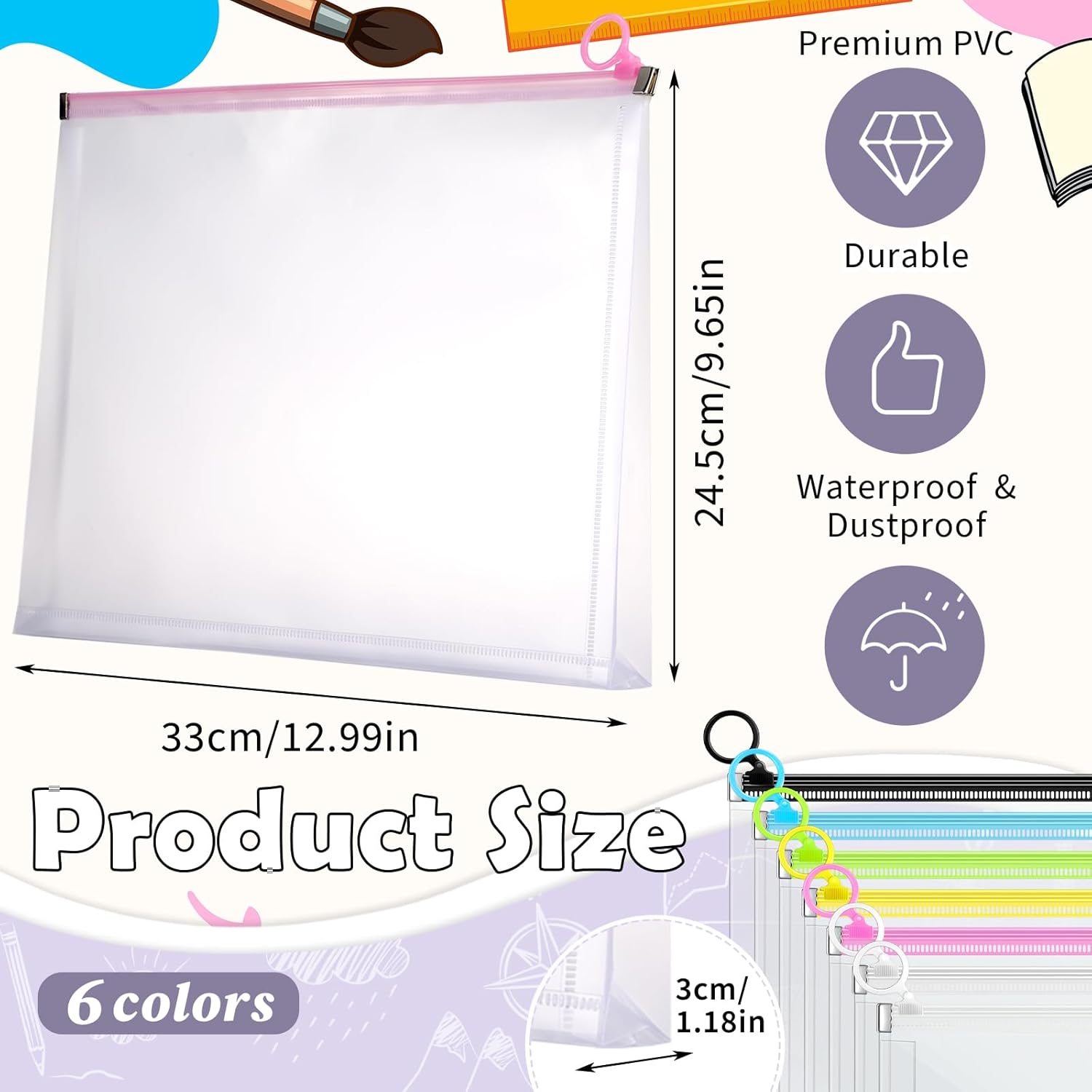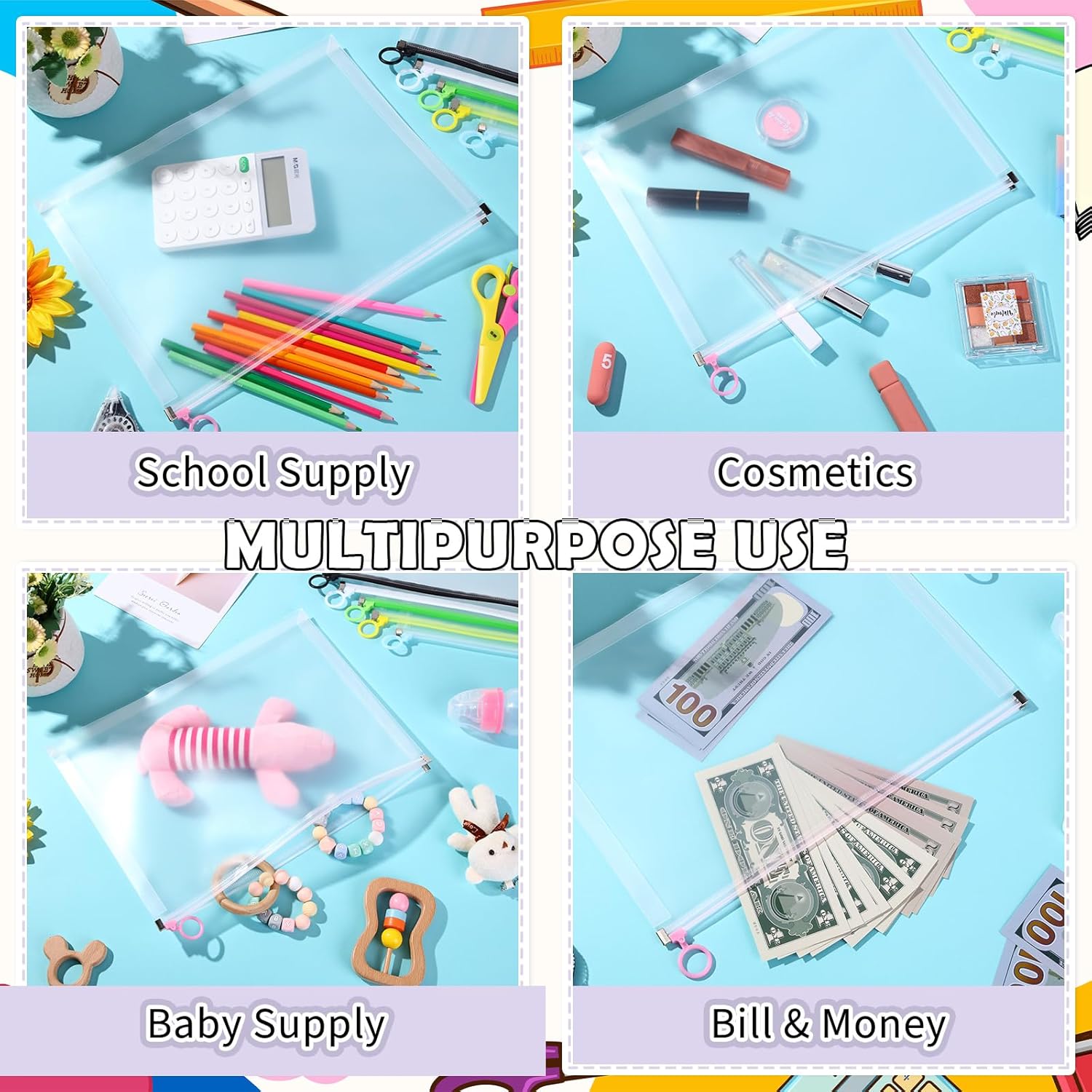 - Quality PP Material: plastic envelopes with zipper are made of quality PP material, sturdy, tear resistant and waterproof, keeping clean, sealed with quality zip, lightweight and long lasting, and the slide zipper keeps your file paper safe, 7 colors zipper for easy assortments