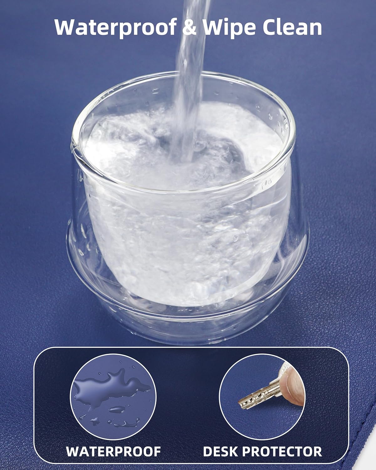 - DESK PROTECTOR:Triple-Threat Protection + Workspace:Engineered to shield desktops from scratches, coffee rings (heat-resistant to 212°F), and spills (wipes clean for 24hrs). Reinforced with stealth-matched jet-black stitching that locks in durability. Serves as:Surface can be used as a large mouse pad, comfortable resting surface for your hands while writing, typing, and using the mouse. A must have office or study supplies.