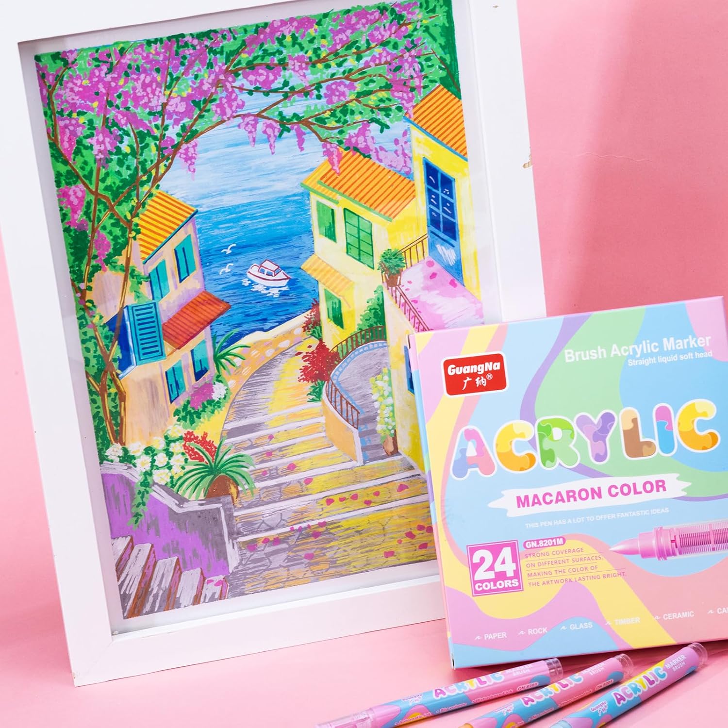 JRQ Macaron Pastel Acrylic Paint Markers, 24 Colors Water-based Acrylic Markers for Wood, Rock Painting Glass Canvas Ceramic Plastic Illustration Comic Animation Art Supplies