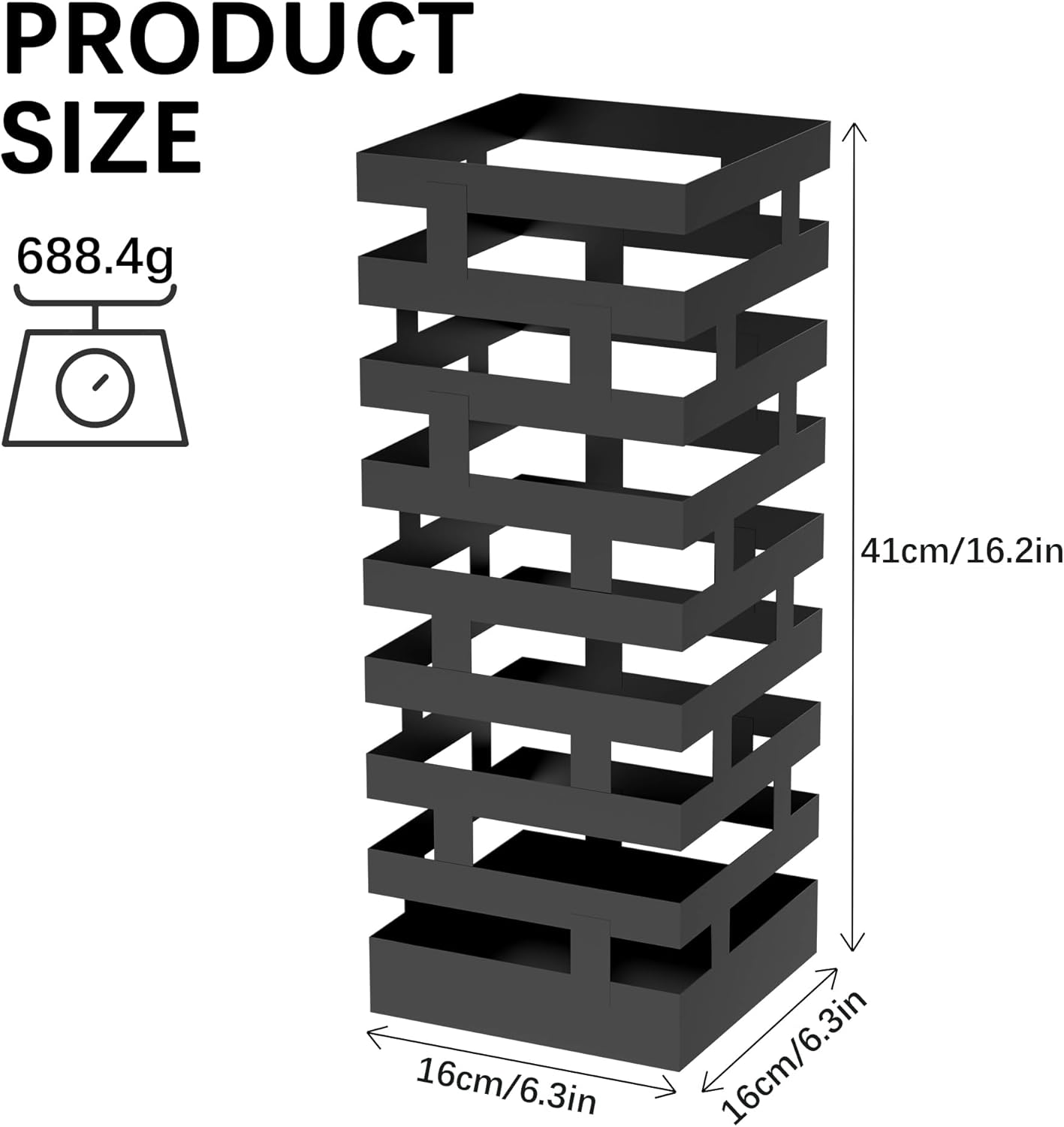 - 【Sturdy Structure】: This umbrella stand indoor made of high-quality metal with anti rust coating, suitable for outdoor use. The size of 6.3 x 6.3 x 16.2 inches is suitable for small and medium-sized umbrellas and folding umbrellas.