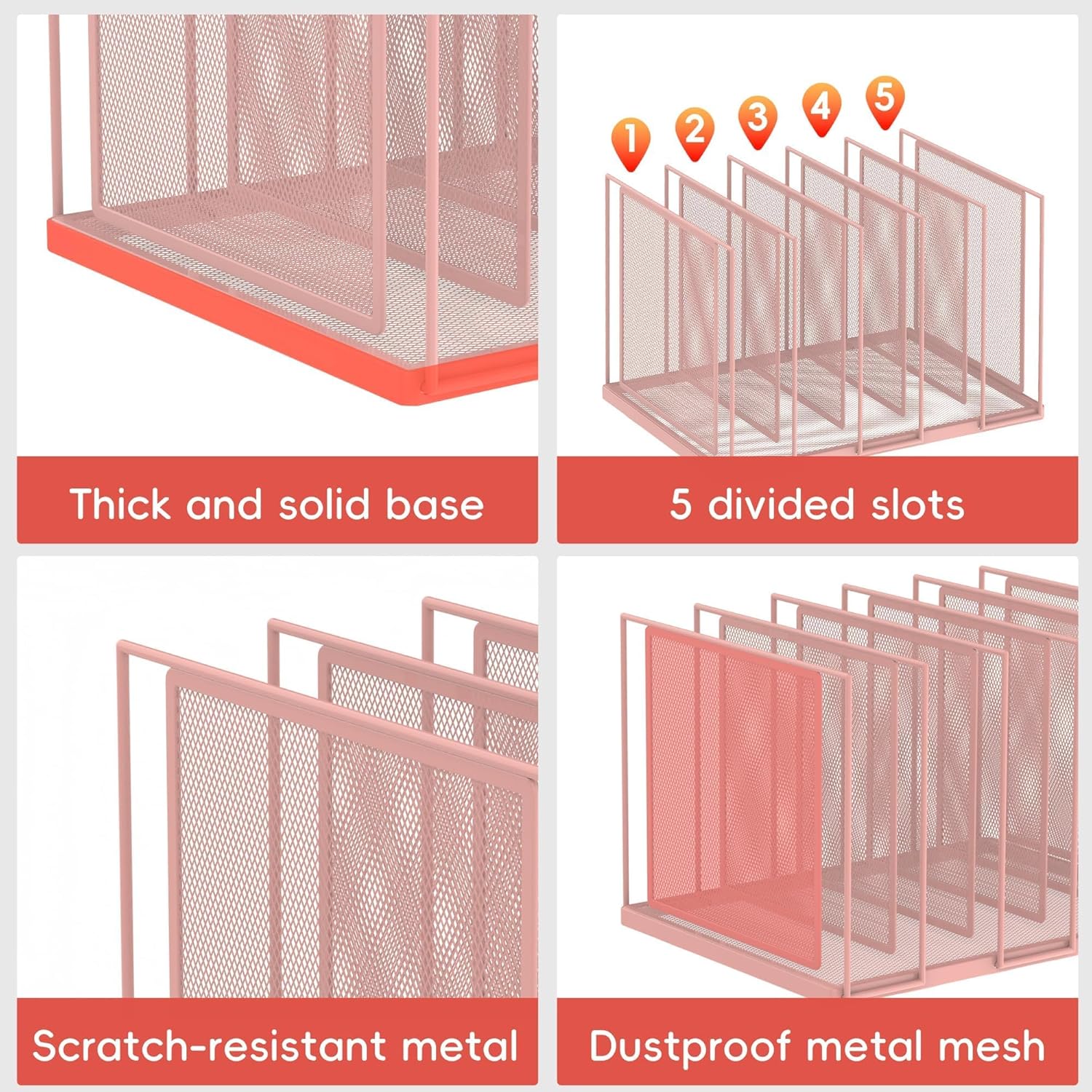 - [High Quality & Durability] The sturdy metal frame and durable steel mesh provide support and stability no matter how many items you put on this vertical file holder. The high-quality powder coat helps resist chipping or scratching, protect your desktop while still beautiful.