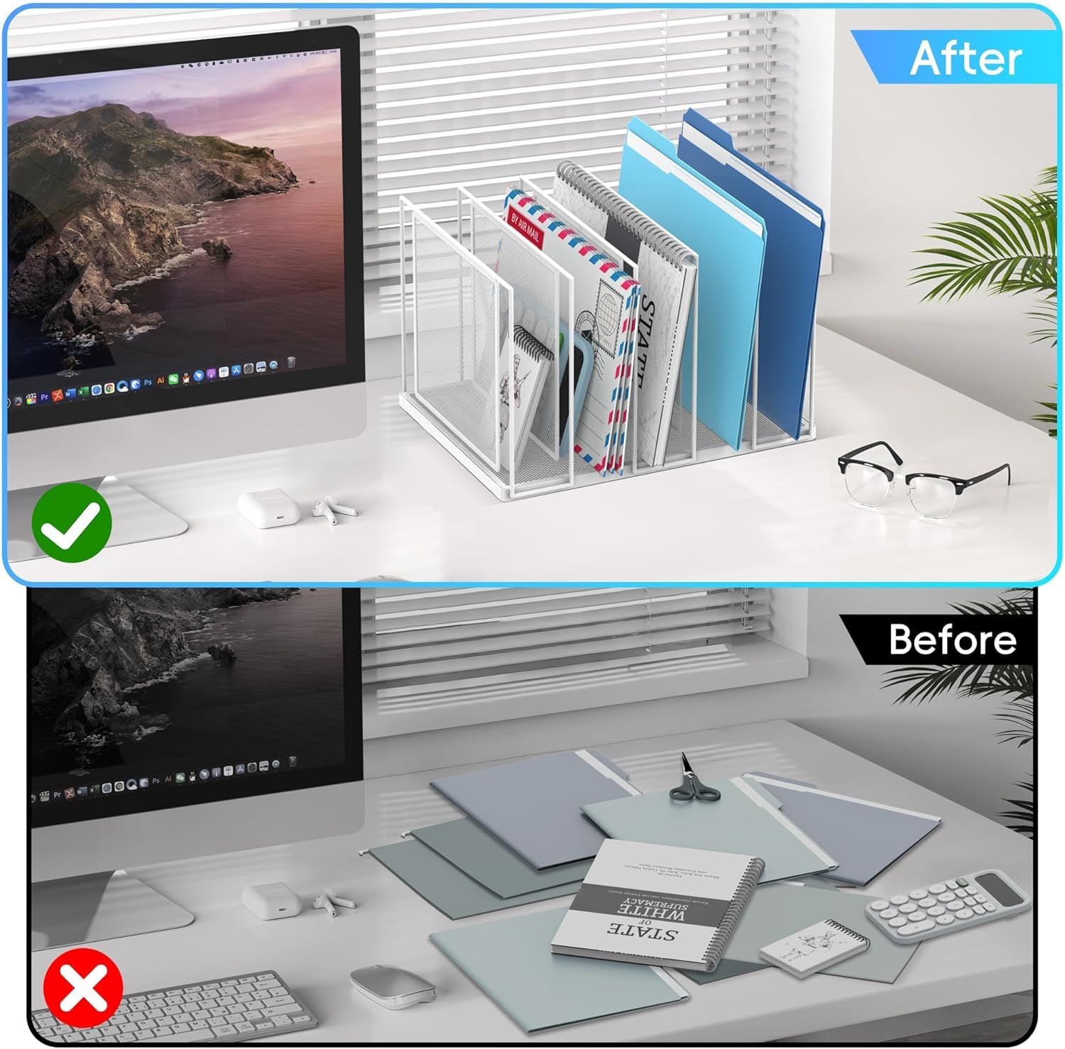 File Organizer for Desk, 5-Section Vertical File Sorter, Paper Holder Organizer Standing Metal File Folder for Office Home Classroom, White