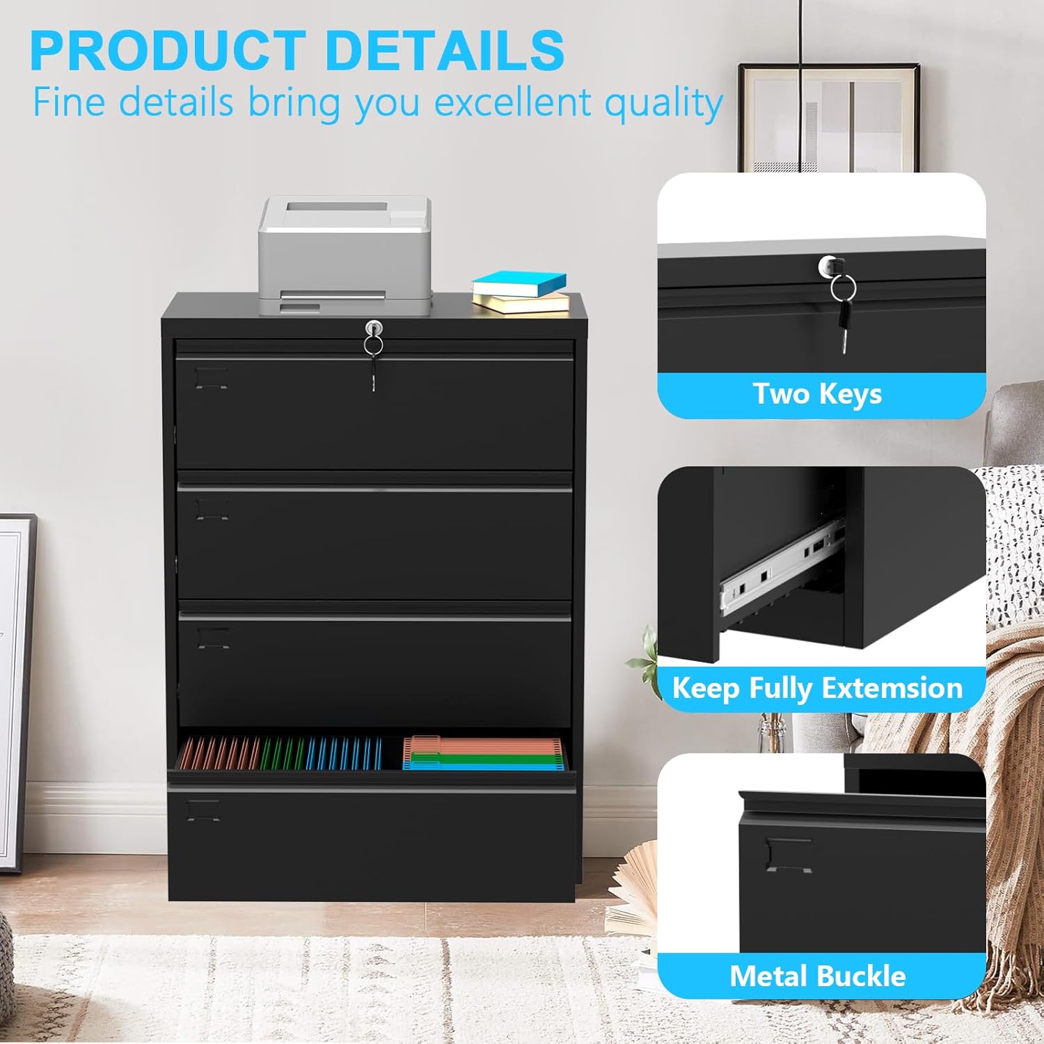 - Spacious 4 Drawer Design: Enjoy ample storage space with four spacious drawers, allowing for efficient organization of your documents and office supplies.