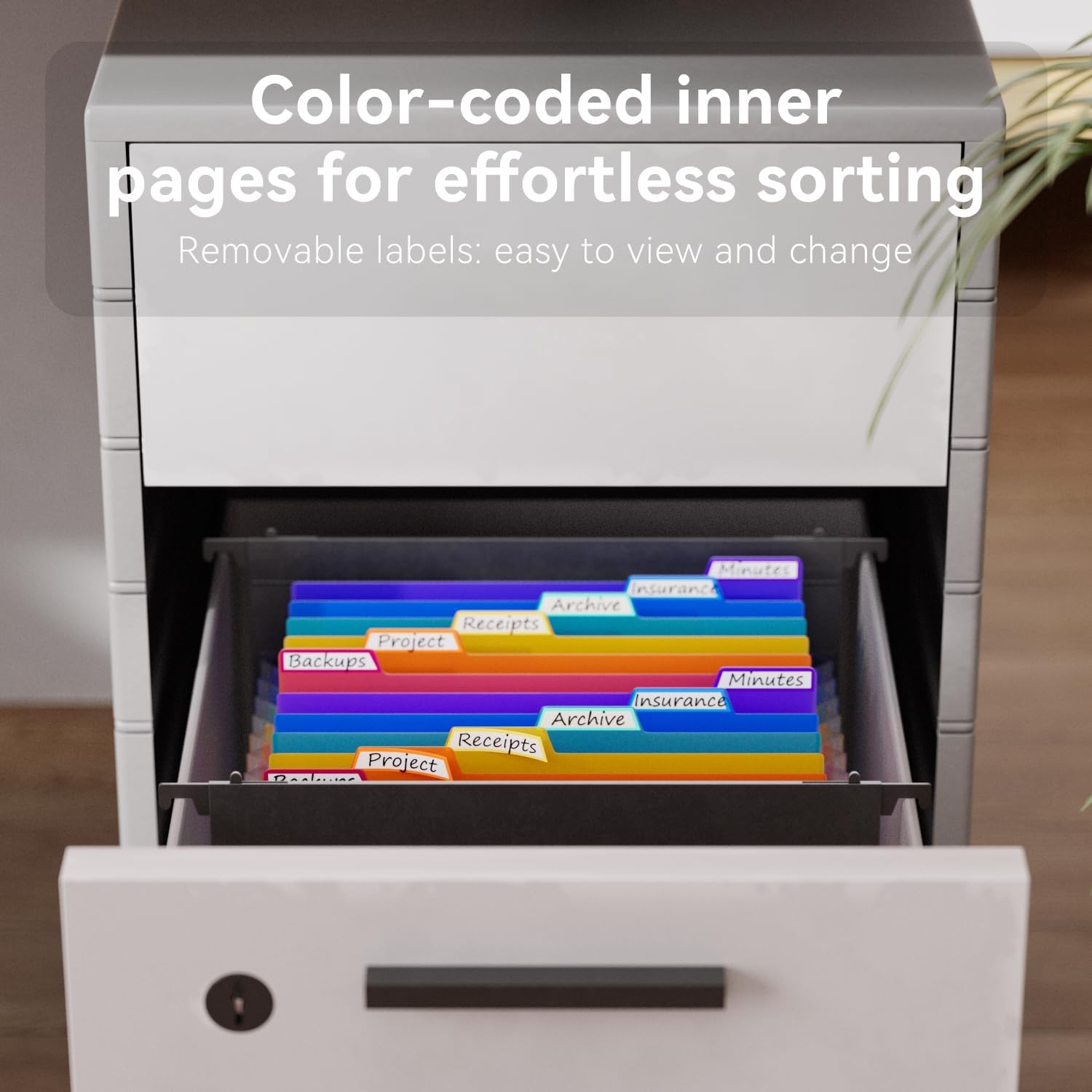 - 【CLEAR CLASSIFICATION, QUICK SEARCH】6 bright colors on the inside pages liven up files. Hanging folder with colorful removable labels, the file folder organizer makes file categories clear at a glance for quick file location. In filing cabinets, clear markings help you quickly find the right folder, making file - searching easy.