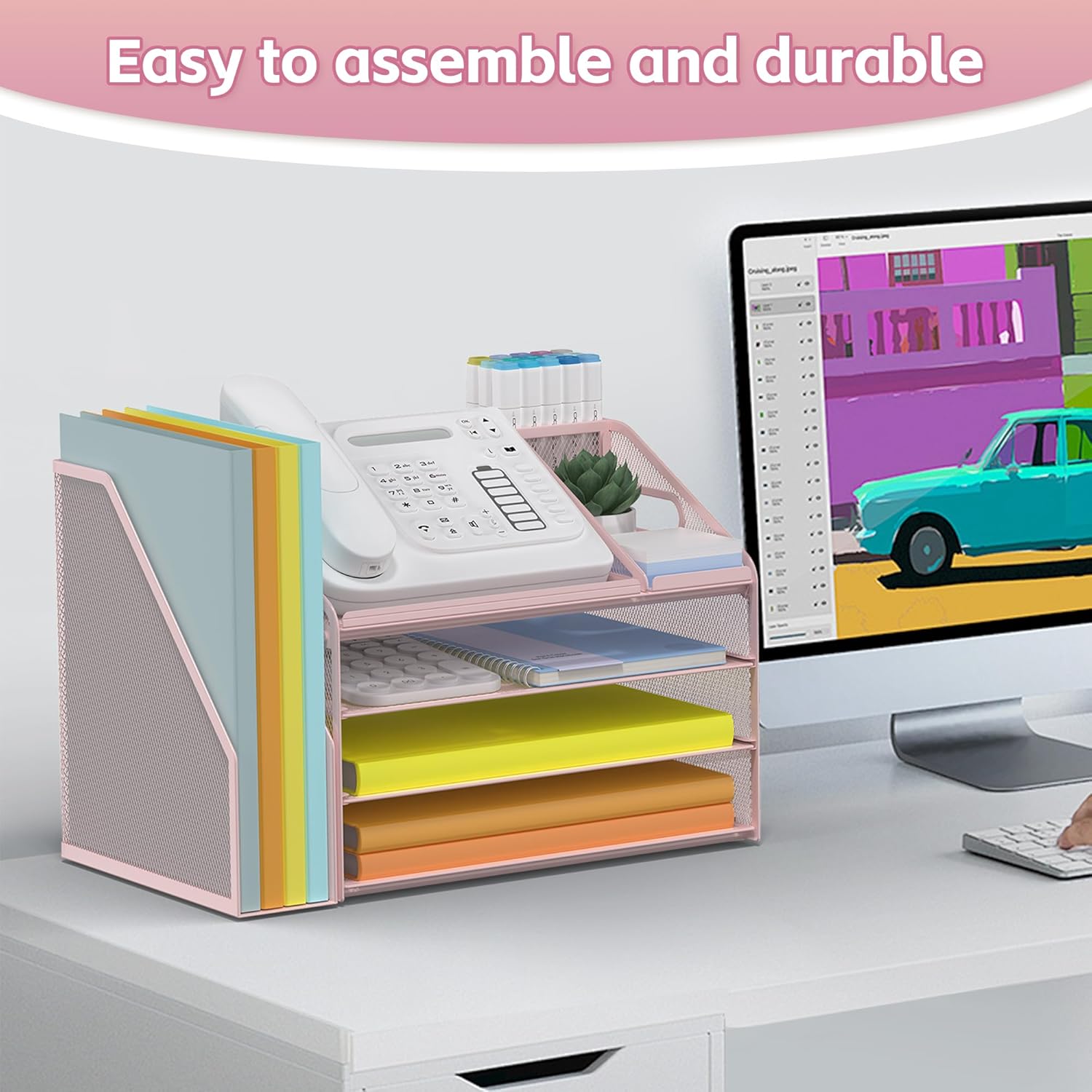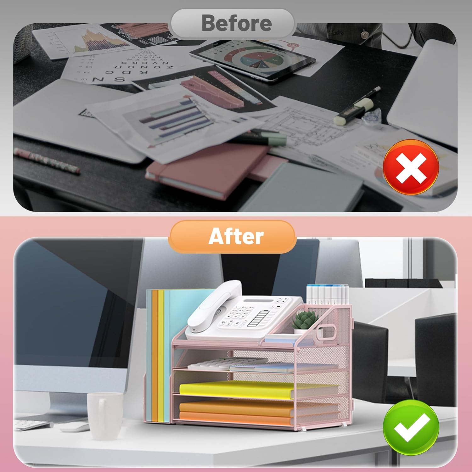 - 4 Tier Organization with Pen Holder: This Pink desk organizer boasts a 4-tier design for efficient sorting of your papers, letters, and other office supplies, along with a dedicated pen holder. It's perfect for maintaining a tidy and uncluttered workspace. The desk file organizer is an essential desk accessory that contributes to an orderly and professional atmosphere