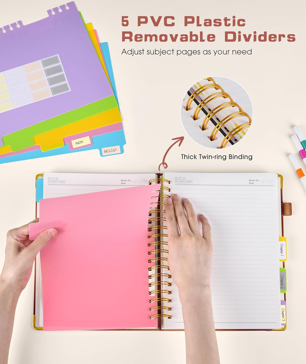 - 【Hardcover Notebooks for Work School】This spiral 5 subject notebooks is an excellent choice for students, professionals, or anyone who like to write things down and needs to keep them organized. A stylish look with gold color stamp font, binding brighten up your dreary desk, also a wonderful gift to work organization, back to school or family records.
