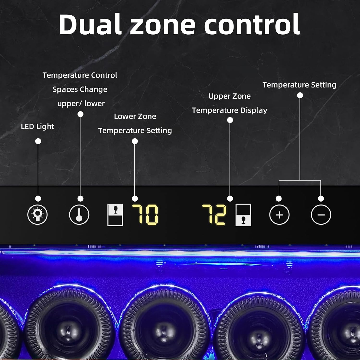 - QUIET & LOW VIBRATION:Advanced cooling system, low vibration effect and noise, allowing your wine to age and settle properly, with no disturbance to its natural occurring sediments. You could change the upper zone temperature from 39℉-50℉ and the lower zone temperature from 50℉-64℉, a suitable temperature will give the wine a better taste.