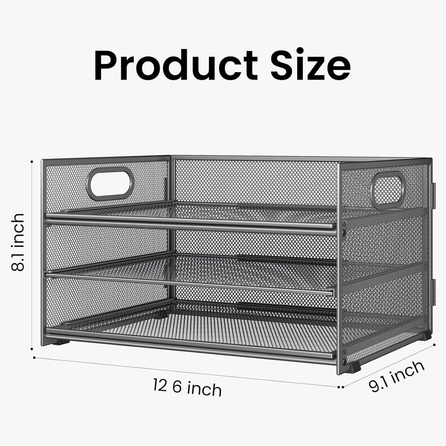 Subekyu 3 Tier Paper Letter Tray Organizer for Desk, Gray Metal Mesh Desk File Folder Sorter Organizer with Handle and Sliding Tray for Home, Office, School Supplies Organization Storage