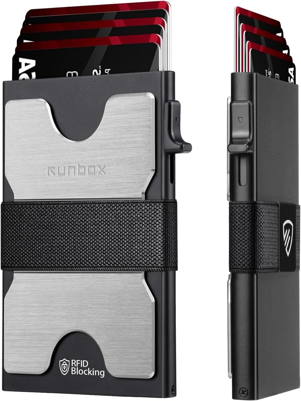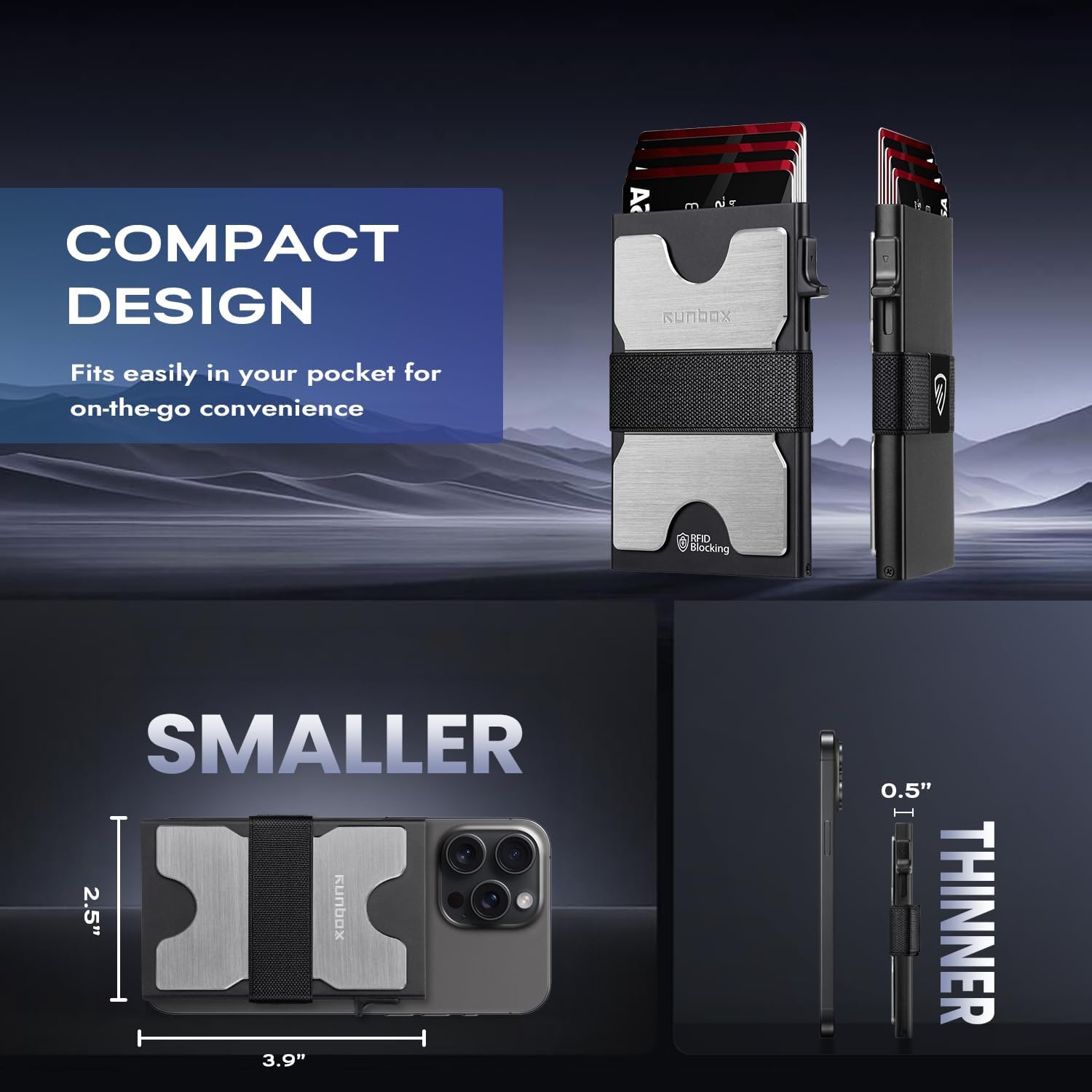 - Quick Access & Expandable Capacity (Holds 1-12 Cards): Experience effortless card access with our patented pop-up button mechanism β press to instantly eject cards. The main aluminum card holder compartment holds 4-6 cards(depending on embossed designs), while the expandable metal backplate adds 6-8 extra slots. *Total capacity varies with card thickness