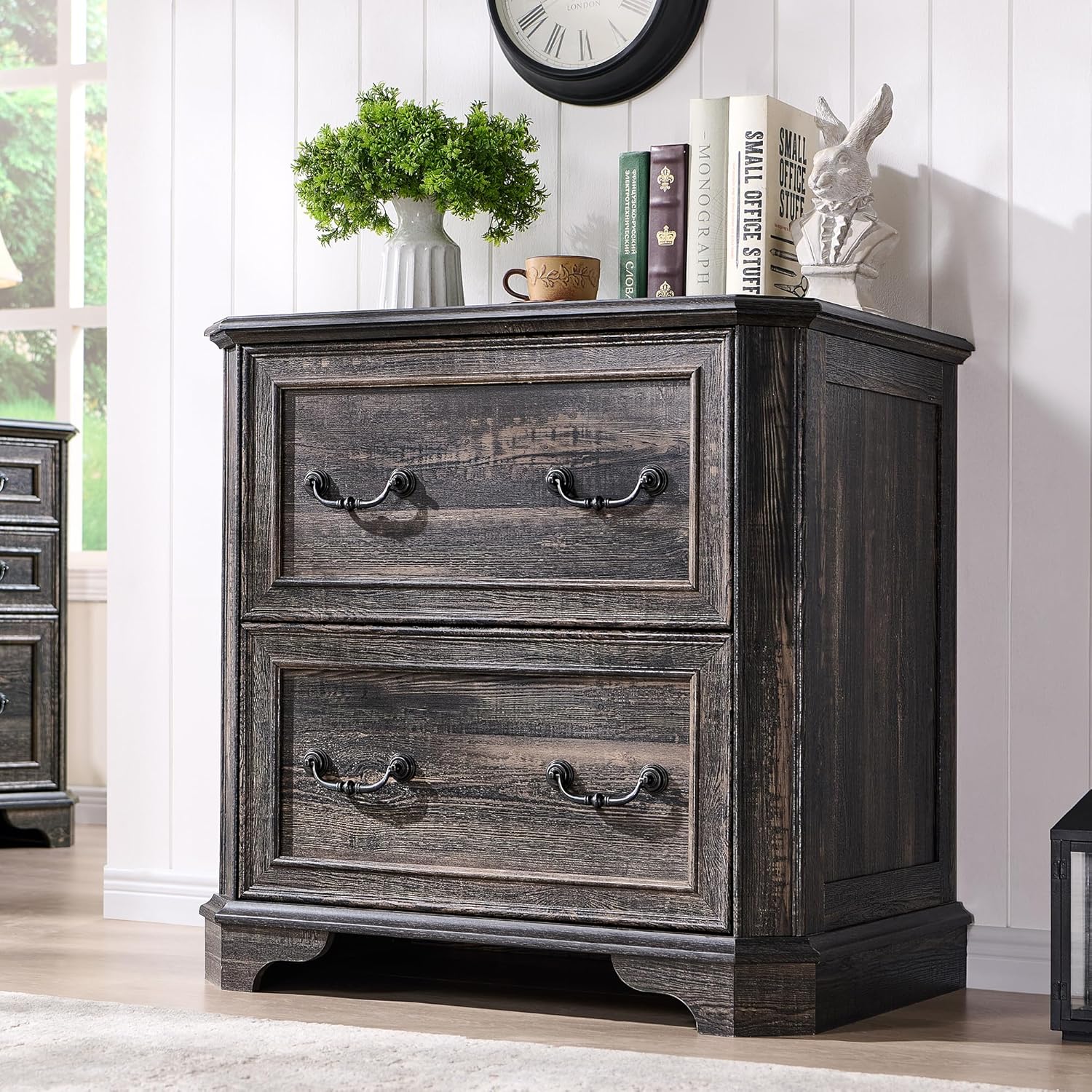 - Exquisite, Robust, and Timeless Design: Experience a blend of Victorian-inspired elegance and modern durability with this 30"L x 21"W x 30"H farmhouse lateral file cabinet. Hexagonal structure design, framed drawer fronts, hand-polished Roman column handles, and natural wood grain textures elevate your home office or living space with structured sophistication. Heavy and gorgeous, with a rich and natural look