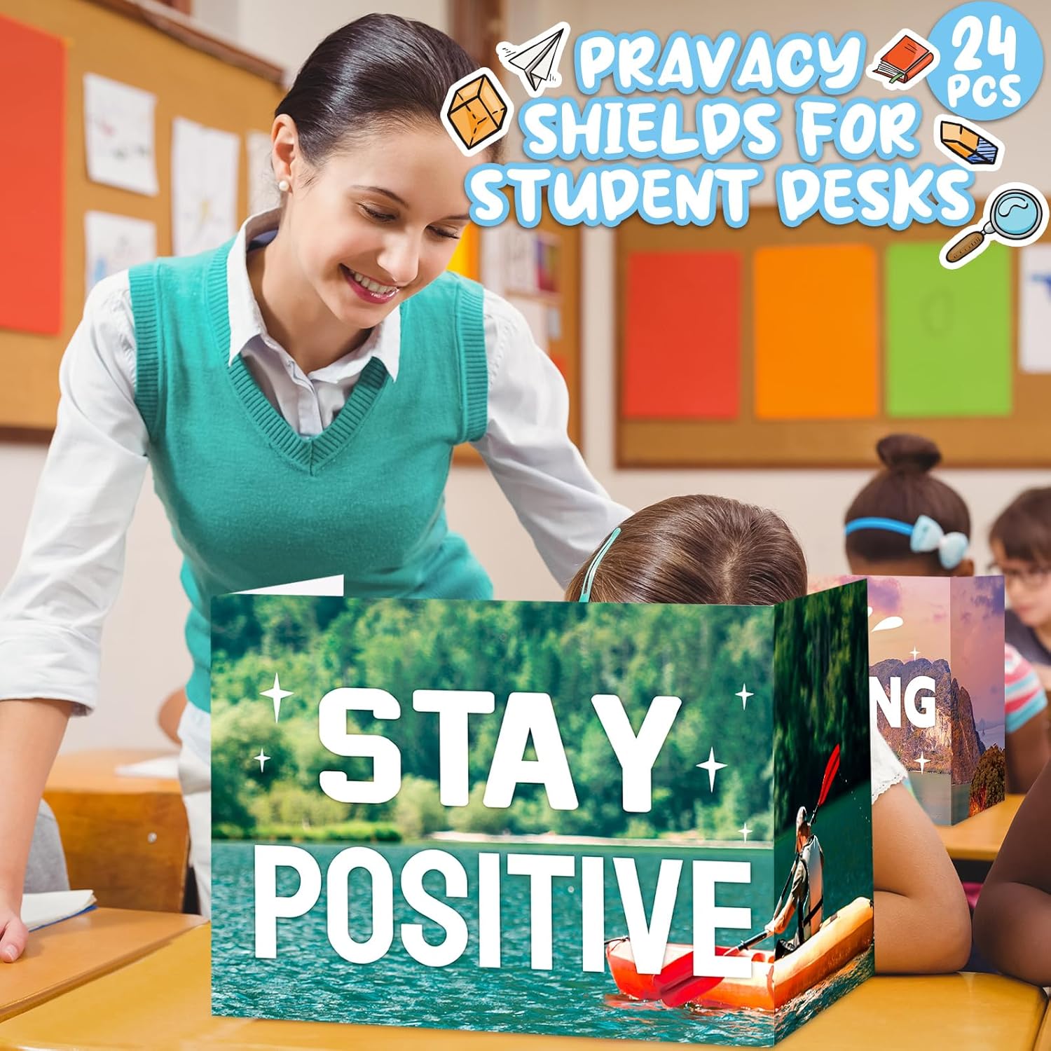Honoson 24 Pcs Bulk Inspirational Privacy Folders for Students Cardboard Test Privacy Boards Motivational Words Desk Dividers Shield for Classroom School Study Supplies, 6 Styles(Scene)