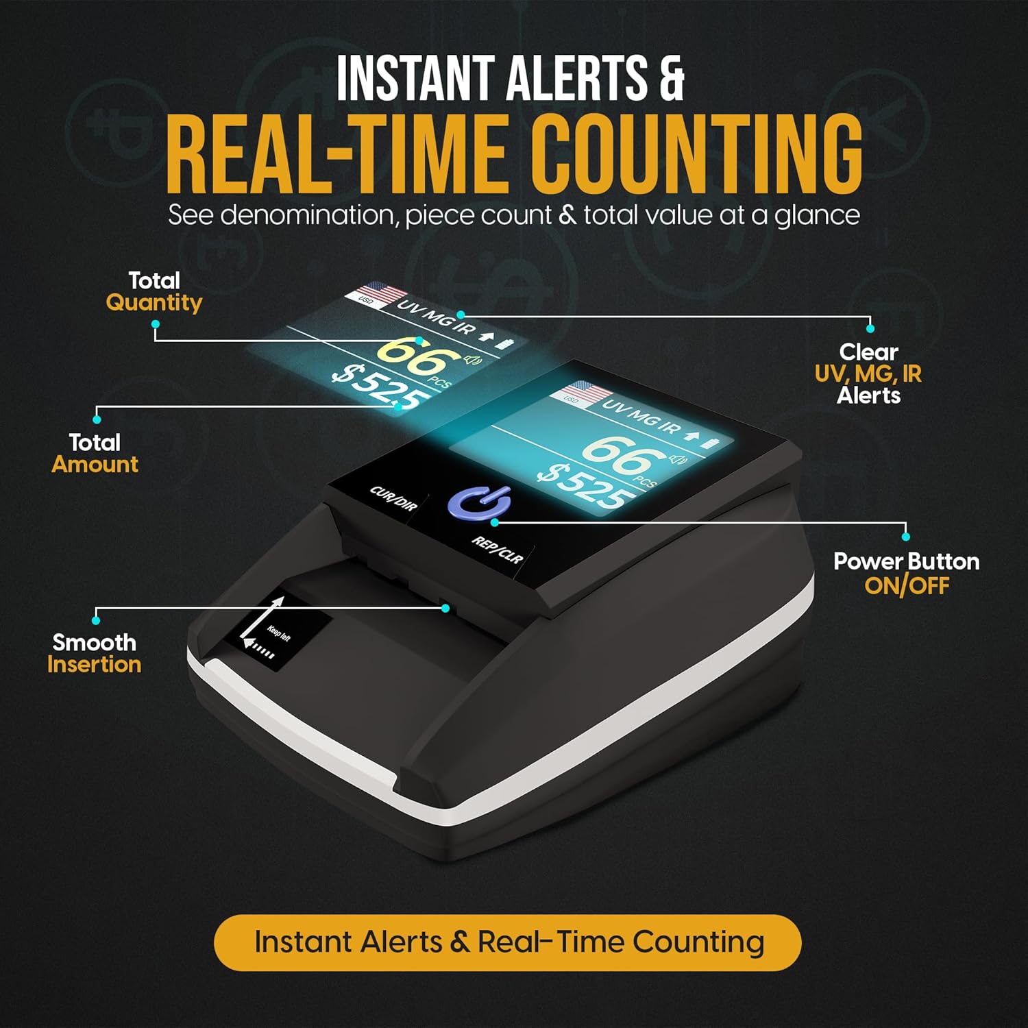 - Full-Color LED Display for Instant Alerts Crisp color icons for UV, MG & IR security markers, along with live piece count, total value, and denomination breakdown — all built into a powerful counterfeit money detector for instant verification