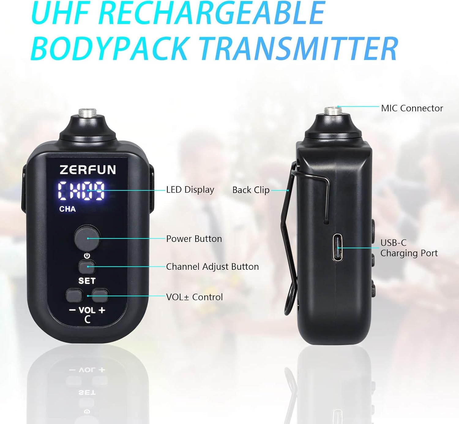 - 4-CHANNEL RECHARGEABLE WIRELESS MICROPHONE SYSTEM: ZERFUN G8 Rechargeable Wireless Microphone System Pro that comes with 4 rechargeable bodypacks, 4 headset mics, 4 lapel mics and metal receiver box with individual volume control. Furthermore, It also featured with automatic frequency scanning and automatic transmitter setup for easy synchonization between transmitter and receiver.