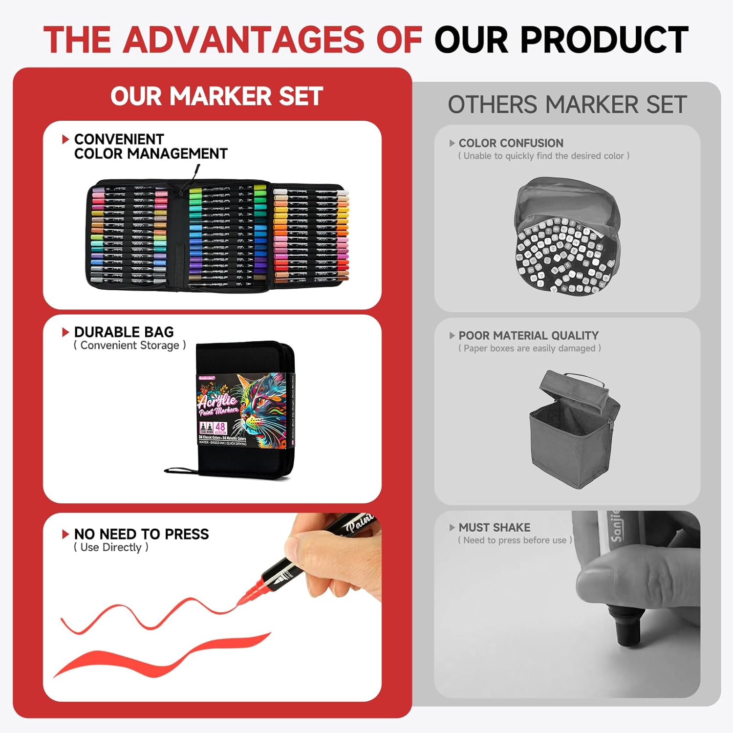 - 【Convenient Storage & Classification】Unlike traditional box sets, our acrylic paint markers come in a stylish carrying case with an organized layout. Each marker is securely stored in a separate compartment, making it easy to find the right color quickly. The lightweight, portable design makes it convenient to carry your markers wherever you go, perfect for artists, crafters, and DIY enthusiasts who love to create on the go.