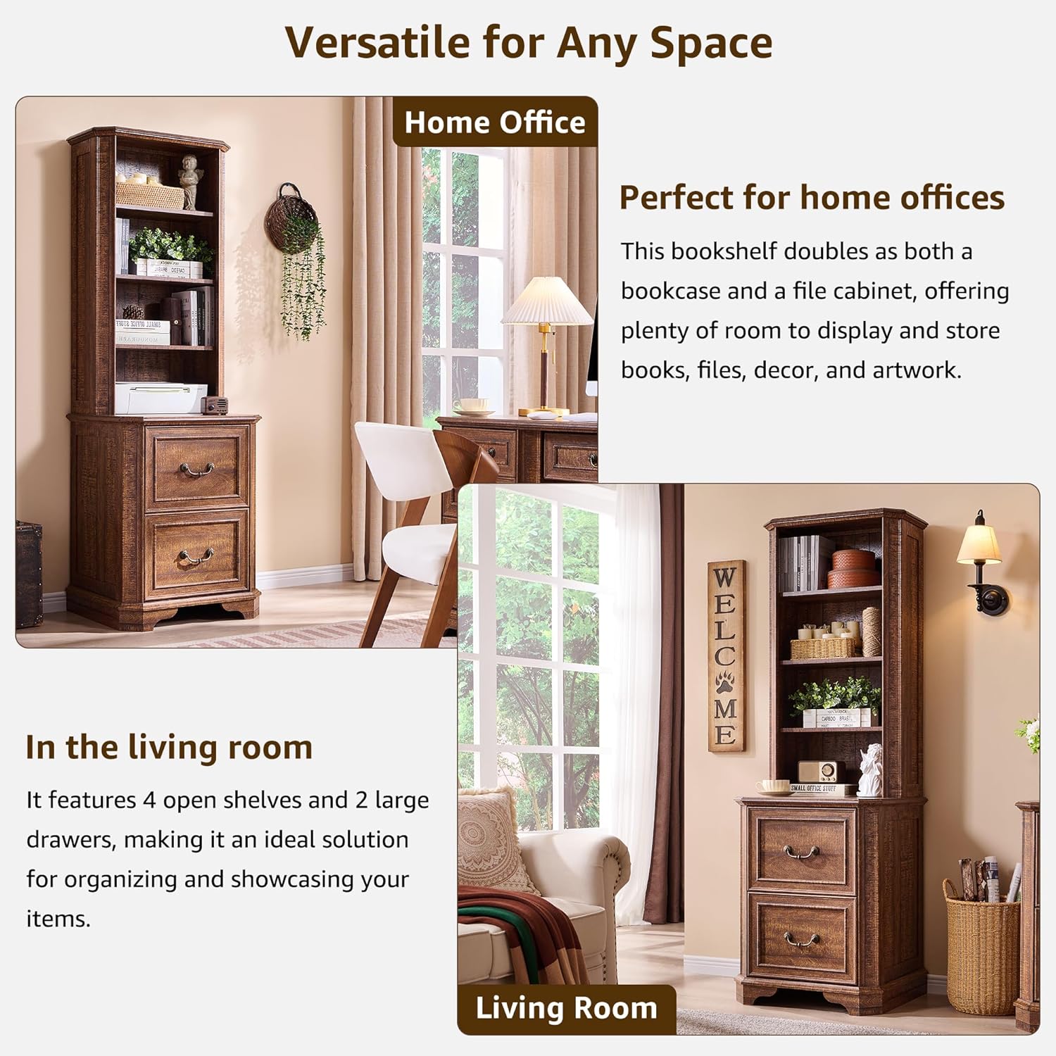 T4TREAM 6-Tier Bookcase with 2 File Drawers, 72" Tall Farmhouse Bookshelf with Storage & Adjustable Shelves, Wooden Floor Standing Display Book Shelf Organizer for Home Office, Reclaimed Barnwood