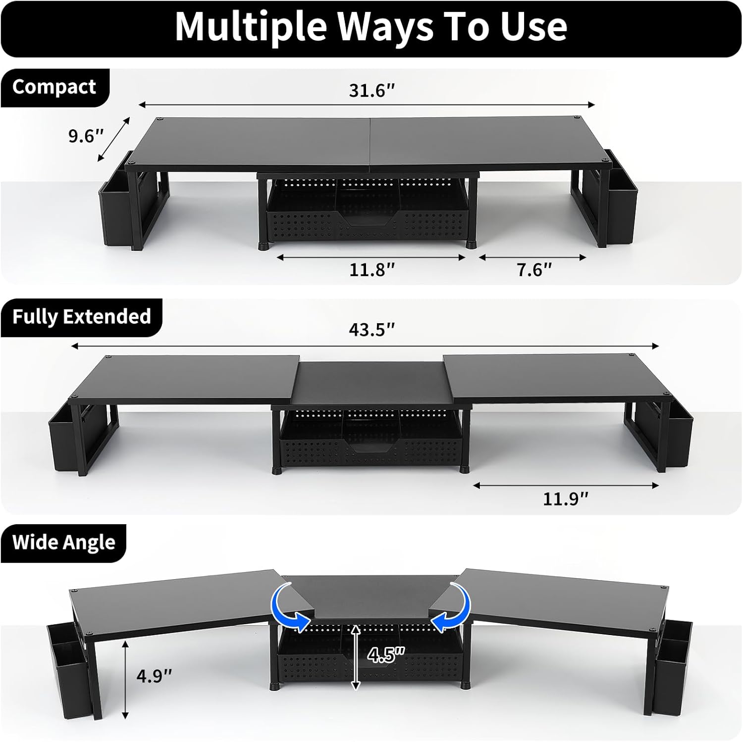 - More Storage Space: Space under the monitor stand can be used for additional desk supplies storage. A drawer tray + 2 pen holders can compartments size for different stationery. The dual monitor stand creating a clear workspace environment