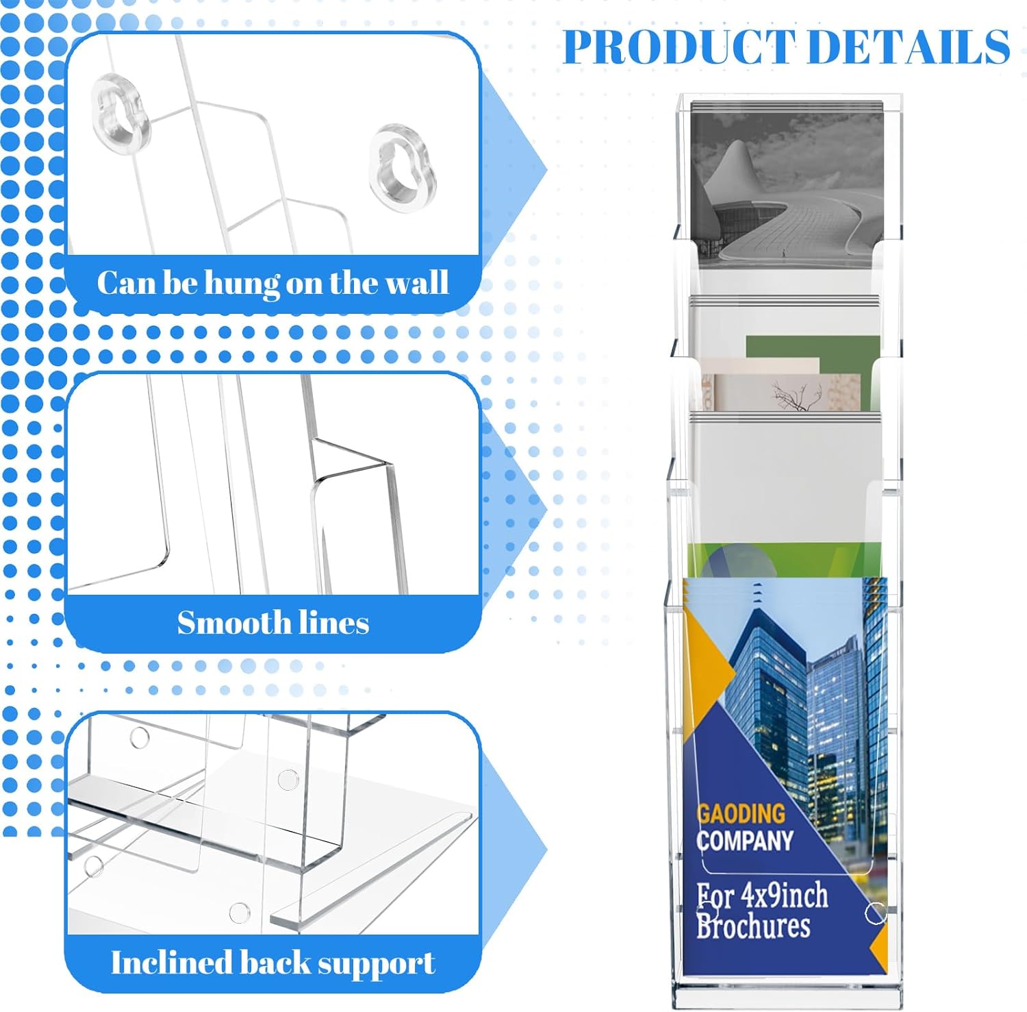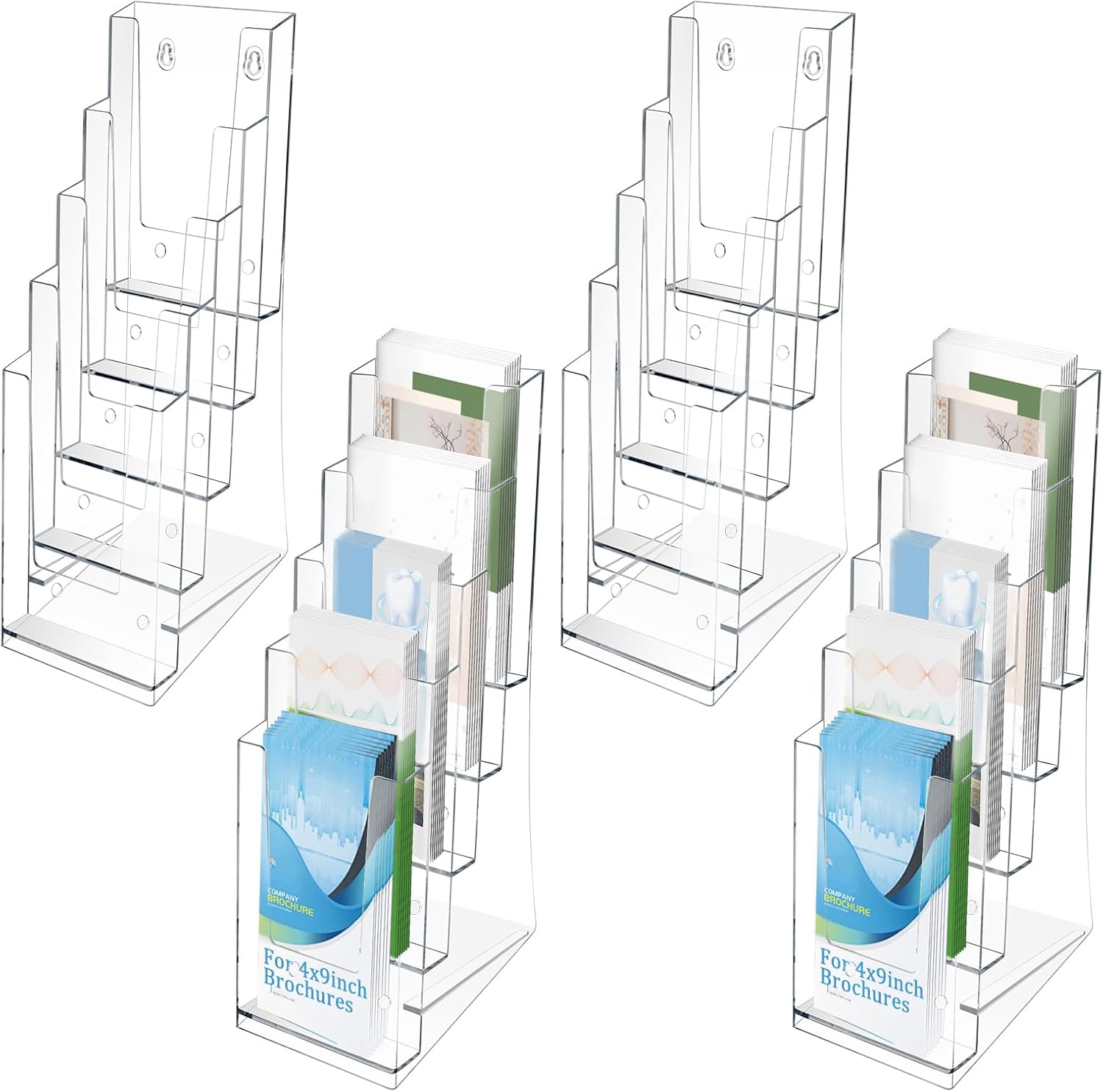 - [Perfect Design for 4 x 9 inch brochures ] The Brochure Display Stand is perfect to hold 4 x 9 inch brochures.This acrylic brochure holder is self-standing, Slanted Back Support on the back of brochure holder allows a smooth movement and more secure standing๏ผyou can use as a wall mount brochure holder