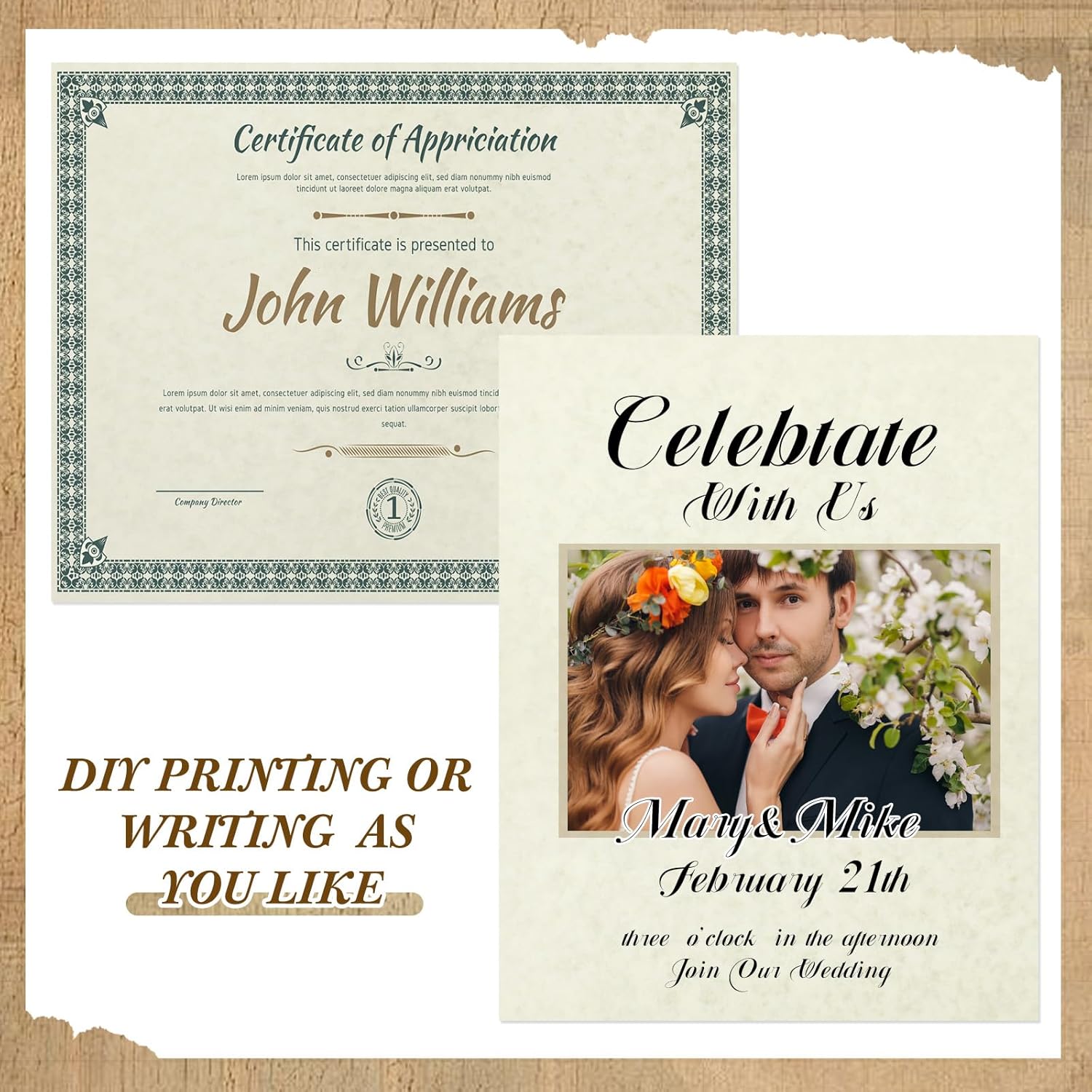 - Work As Different Things: these plain certificate papers are flexible in use, you can use them as certificate printing, wedding invitation, birthday invitation, restaurant menu, theme party decoration and so on, running smoothly in laser and inkjet printers, copiers and offset applications without jams