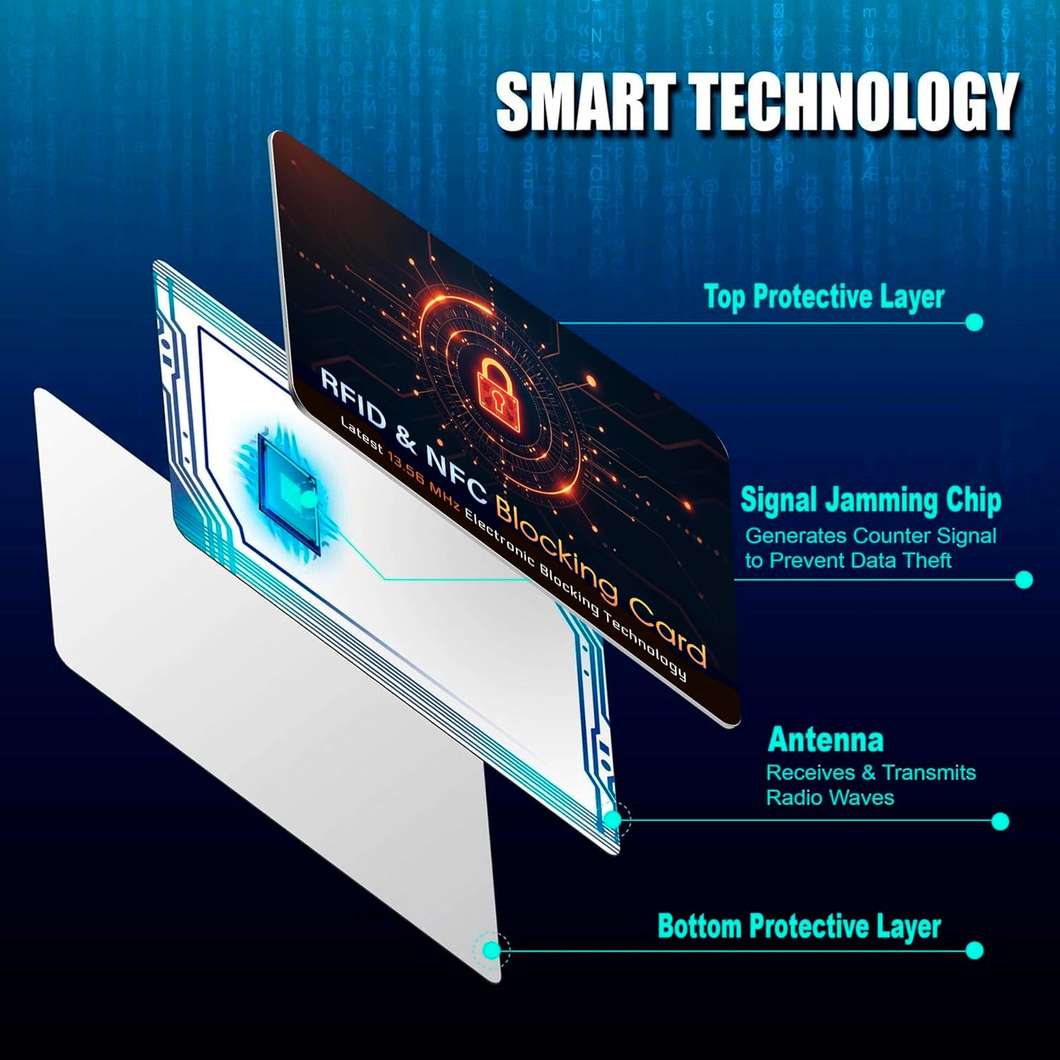 - JAMMING CHIP: An antenna and jamming chip makes up the main components of the card. The antenna will sense incoming radio waves and draw power for the chip to create a jamming signal. Lifetime usage as the card does not require battery.