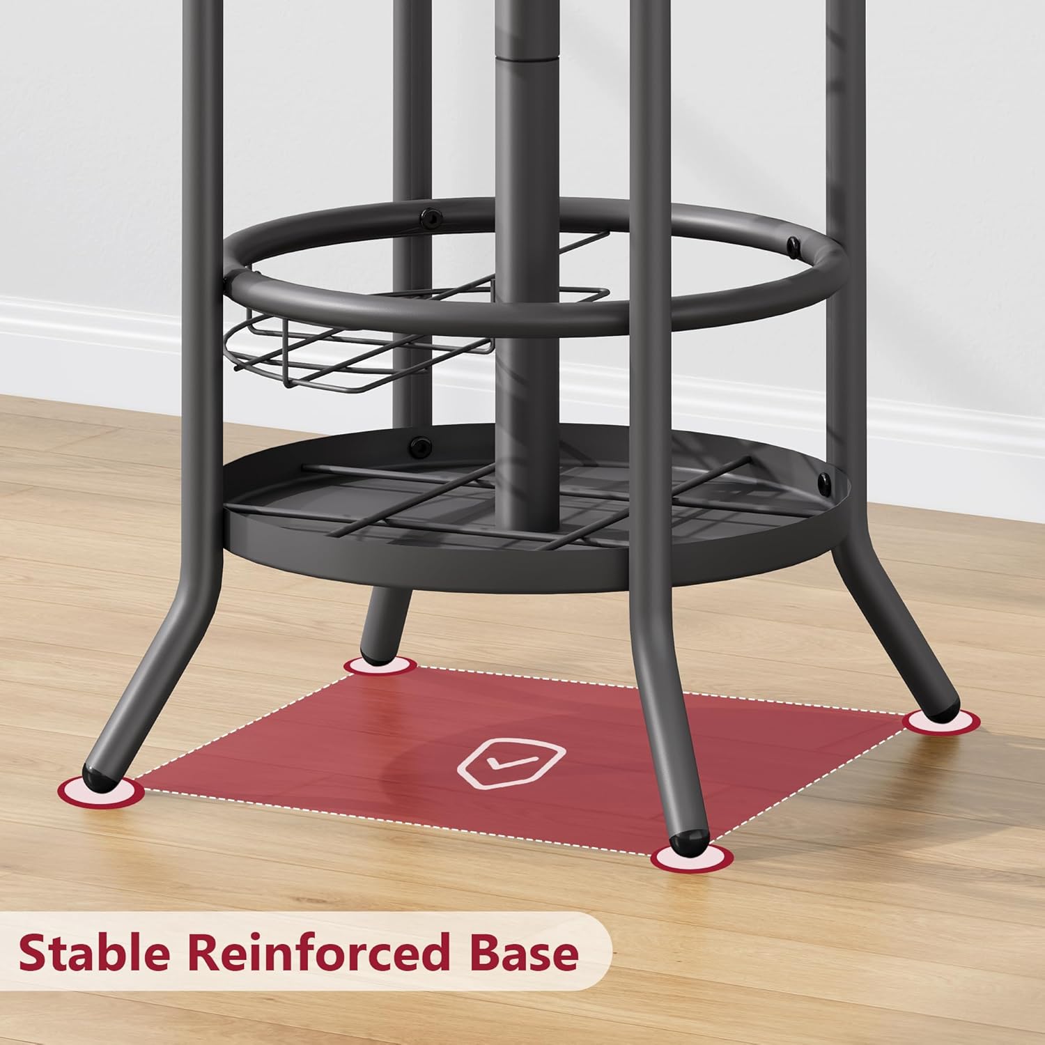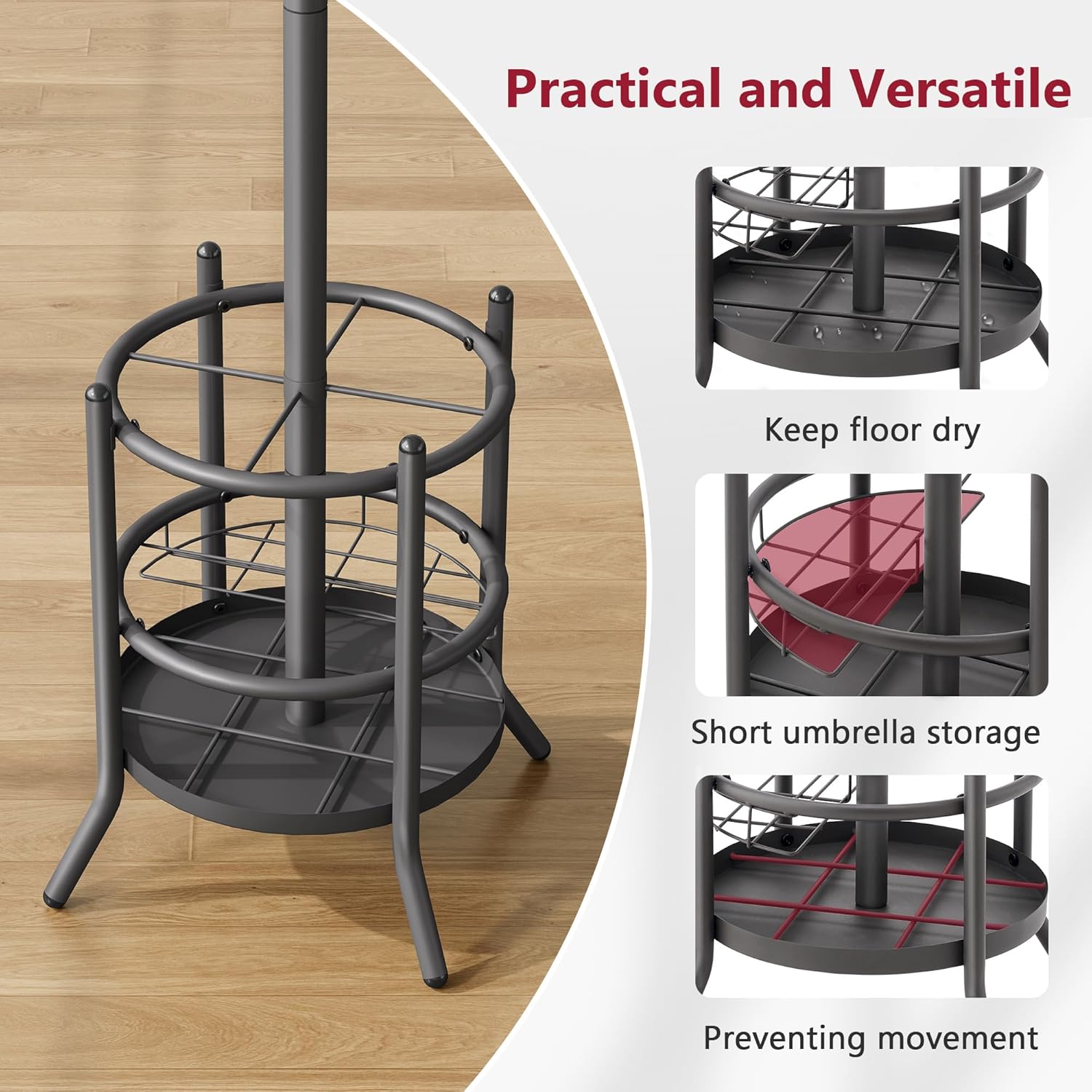 - 【Practical Umbrella Holder】This coat tree comes with a short basket for folded umbrellas and 4 extra hooks to increase your storage space. The grid base is non-slip and protects floors from water damage.