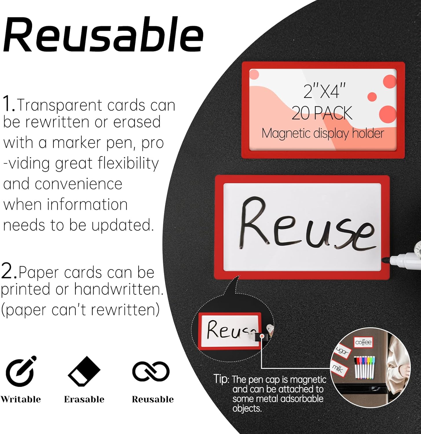 20Pcs Magnetic Plastic Label Holder 2x4 inch for Supermarket Store Price Tag, Metal Shelf File Storage Cabinet Drawer Label Tag Resuable with 8 Color Chalk Makers, 20Pcs White Paper (Red)
