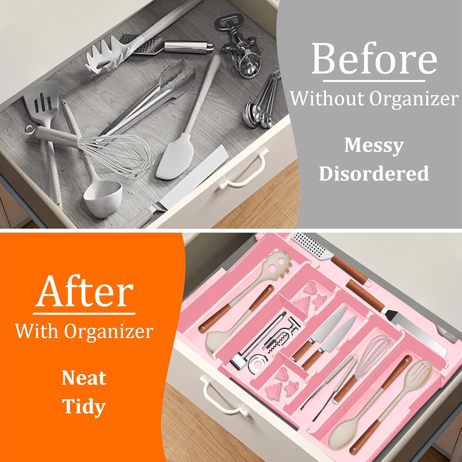 Large Utensil Drawer Organizer Expandable Silverware Organizer for Kitchen Drawer Adjustable Cooking Utensil Holder Cutlery Flatware Tray Spatula Tools Gadgets Storage Dividers Plastic Pink