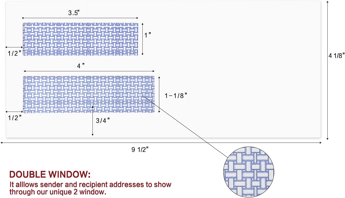 - DOUBLE WINDOW ENVELOPE DESIGN: Envelopes with dual window allows sender and recipient address to show through our unique 2 window, secure envelopes suitable for everyday business, legal mailing, and business billing statements while protecting sensitive contents and information.