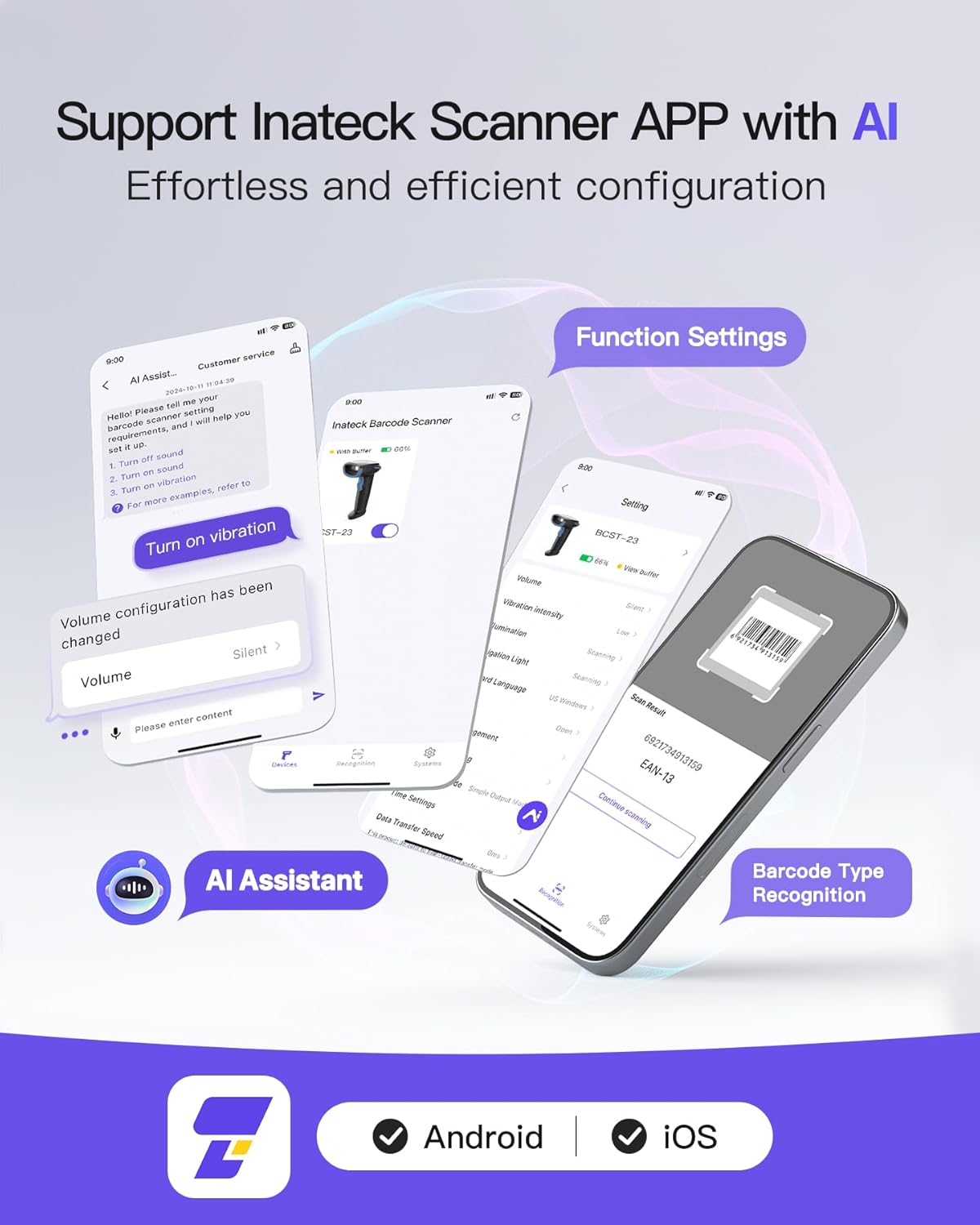 - Support Inateck APP: In the app, easily configure your bluetooth barcode scanner, eliminating the frustration of losing the manual. Common functions such as barcode type recognition, Bluetooth connection and management, battery level display, alert preferences, and barcode type settings can all be effortlessly configured in the app. Stay tuned for continuous updates with more applications and features