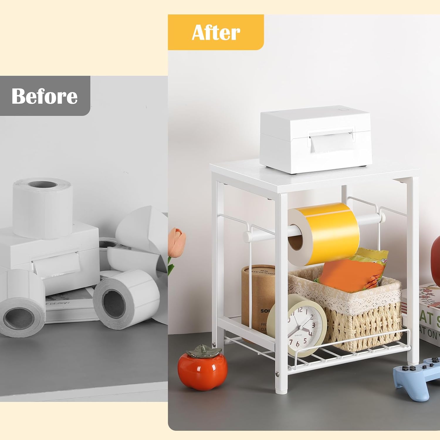 - 【A Must-have Office Assistant】The label roll holder is designed for both practicality and aesthetics, measuring 11.8 x 7.8 x 13.4 inches. The wooden top panel holds your thermal printer, the lower tier features support rods for label rolls, the bottom basket holds folded labels and other office supplies, creating a perfectly organized desk.