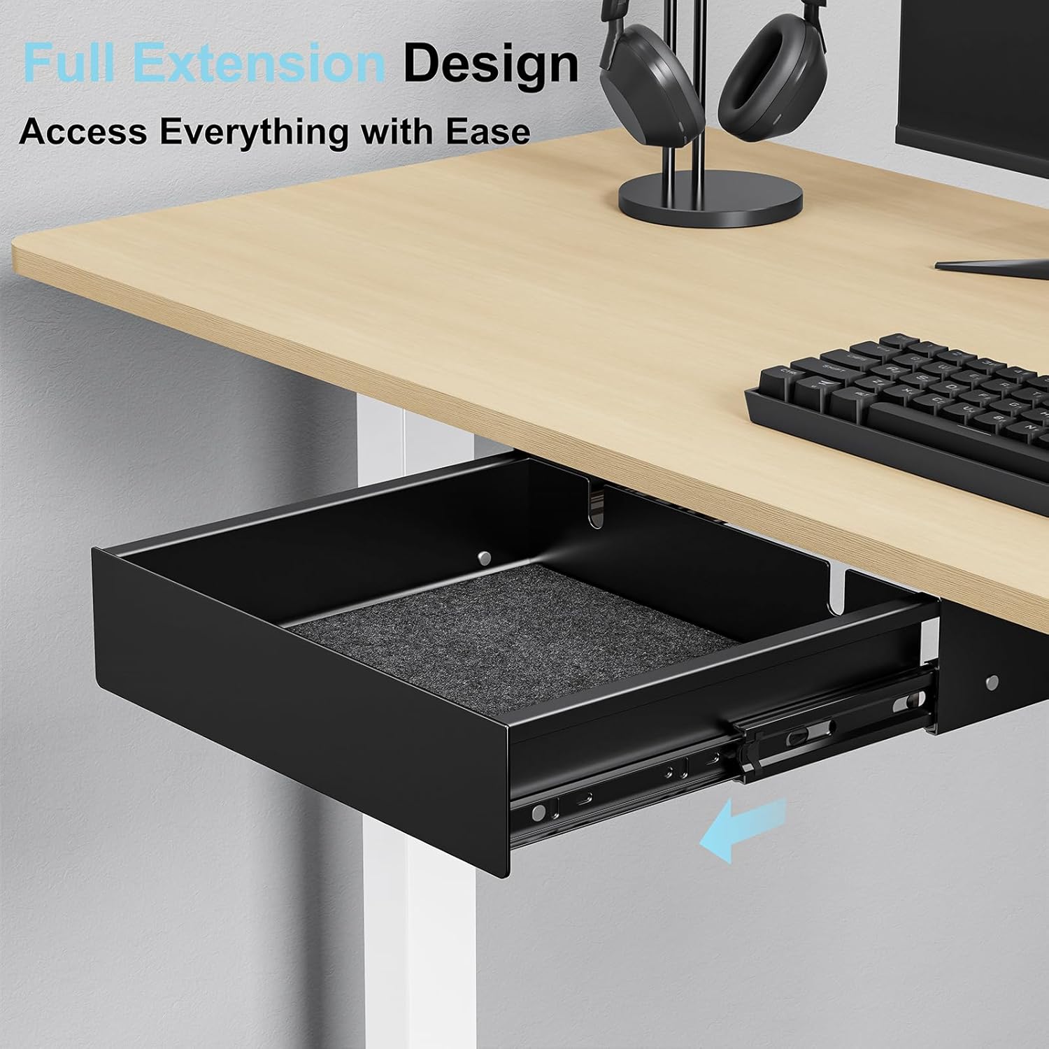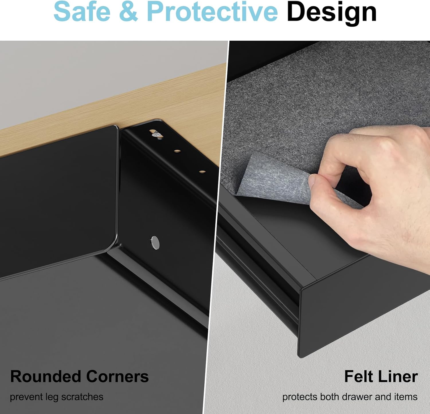 - SAFETY-ROUND STEEL DRAWER— Crafted from durable black-coated steel, this under desk drawer features smooth rounded corners for a clean and elegant look. The sturdy steel drawer resists dents and scratches, perfect for modern offices that balance durability and style