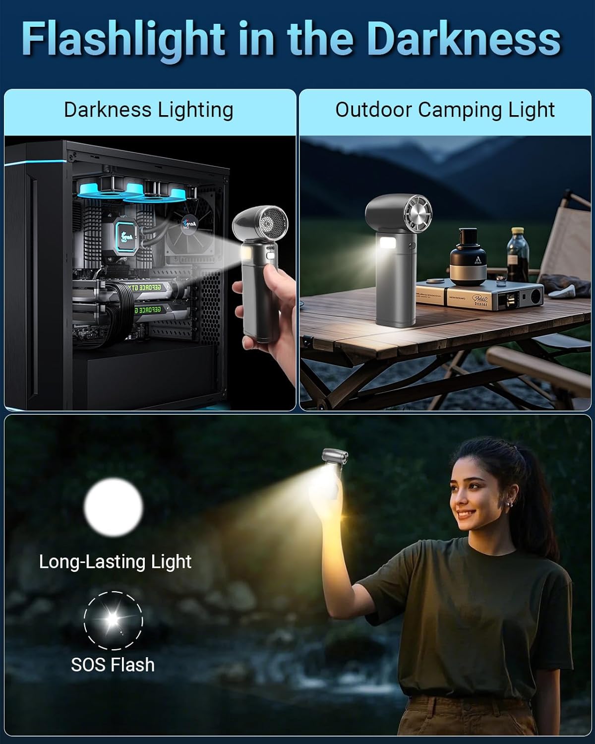 - â ăAll-in-One: Cooling, Drying, Cleaning & InflatingăTurbo jet fan beyond cooling.More than just a fan! Use jet airflow to clean dust, dry clothes, inflate air pillows, or cool down quickly. Comes with a nozzle for precise targeting. Ideal for tents, car seats, keyboards, cameras, or home use for daily life or outdoor adventures.LED light illuminates dark spaces for nighttime camping and backcountry hikes.
