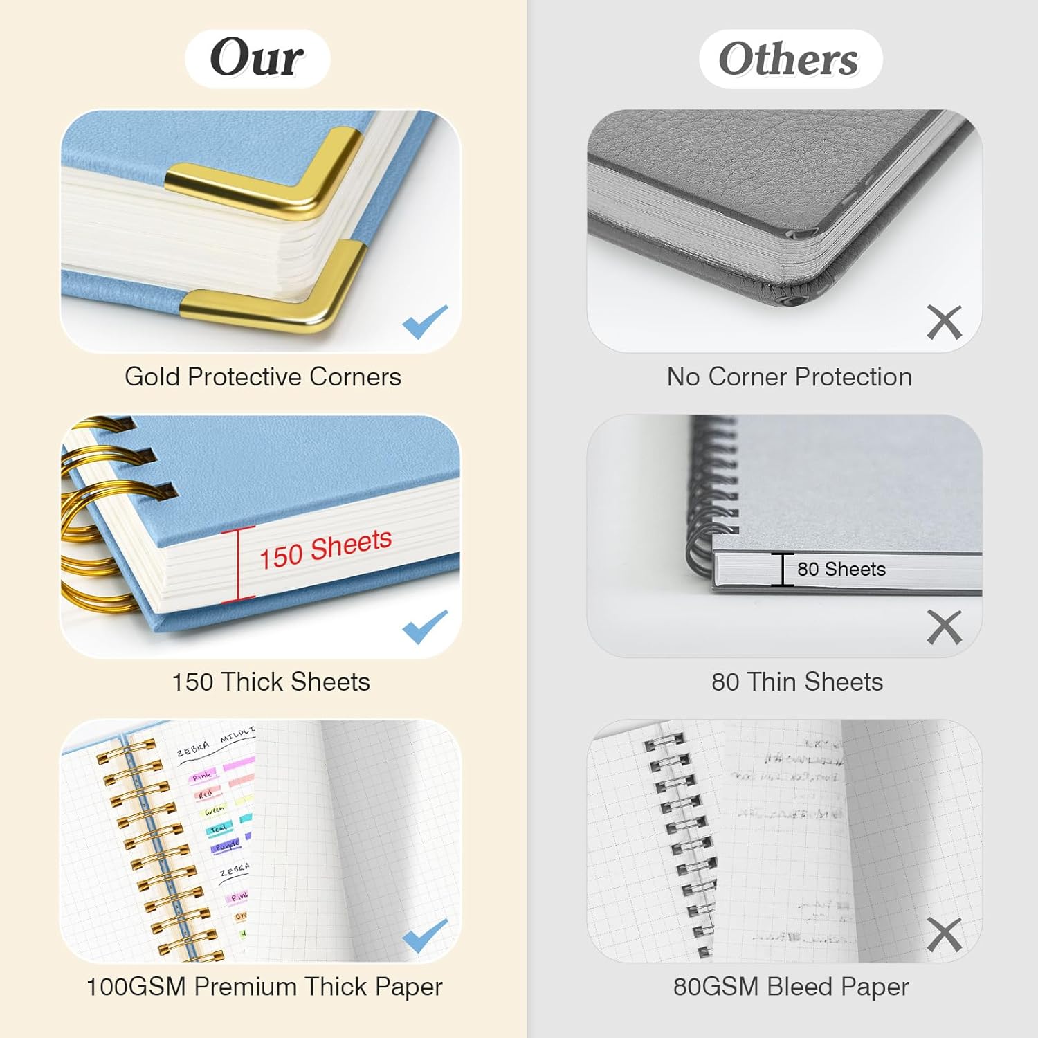 - 【Premium Leather Cover & Strong Binding】Spiral notebook showcases a luxurious leather hard cover, complete with golden corner protectors for extra durability. Its professional design not only looks stylish but is built to last. The strong metal double spiral binding allows for a full 360° lay-flat design, making writing more comfortable and efficient. Whether flipping through or laying the Subject notebook flat, this design guarantees a smooth writing experience.