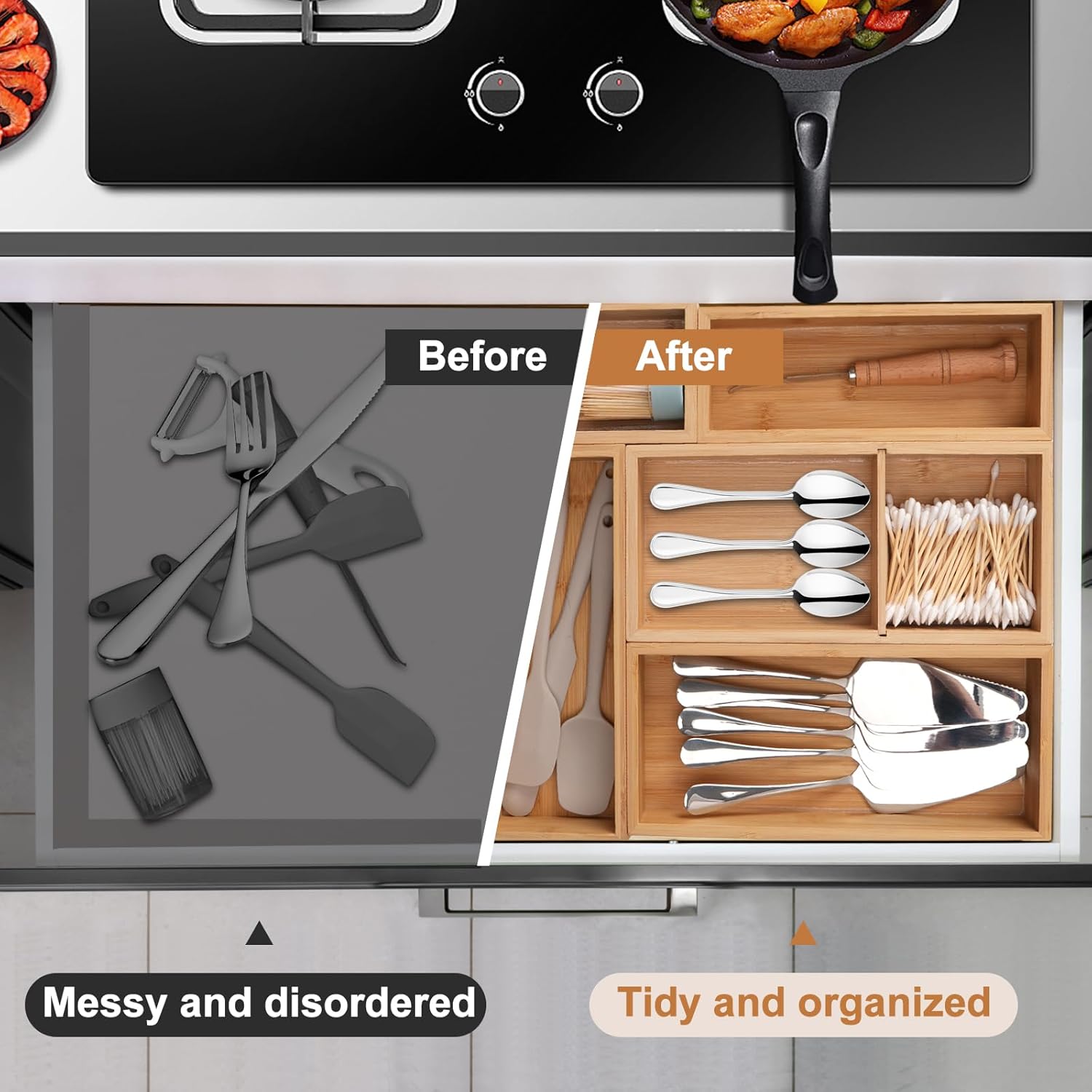 - Bamboo Drawer Organizer:Do you need the ultimate storage essentials to stay organized? Look no further than this indispensable and versatile bamboo organizer set! This 5-piece bamboo drawer organizer set is perfect for keeping your home clutter-free and organized. Whether you're storing makeup, jewelry, office supplies, or kitchen essentials, these stylish bamboo organizers are ideal for everyday use.