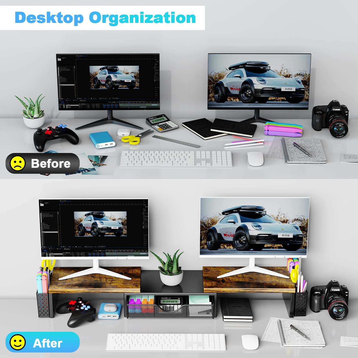 - Dual-screen office efficiency improvement: This desktop organizer is equipped with a dual-display stand, which can place two monitors at the same time, effectively expanding the workspace. It also has adjustable length (27.6-40.6 inches) and angle to provide you with a better viewing experience.