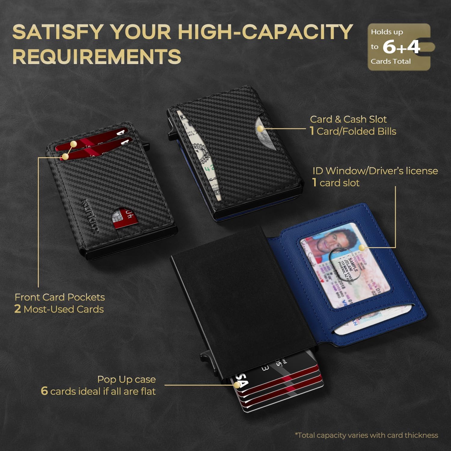 - QUICKEST ACCESS: Get instant card access with just one hand by tapping a button. The front pocket holds your 2 most-used cards, while the pop-up aluminum card holder stores 1-7 cards (The actual capacity depends on the card thickness ) . Features an ID window for your driver's license and a back pocket that fits one card or cash