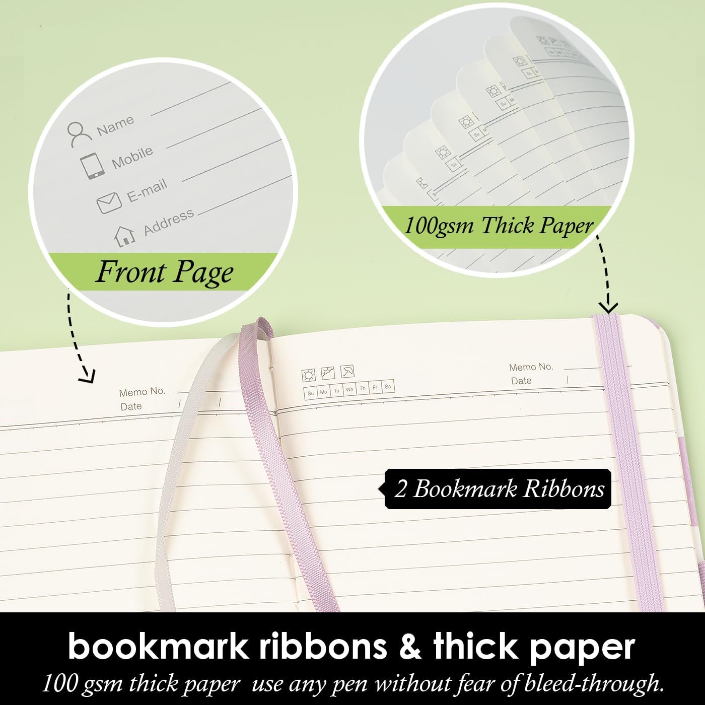 - The small notebook is made of 100gsm ivory thick paper, the paper is smooth, the writing is smooth, and the ink will not bleed. The pocket notebook comes with elastic pen holder loop, elastic closure, and 2 colorful ribbon bookmarks.