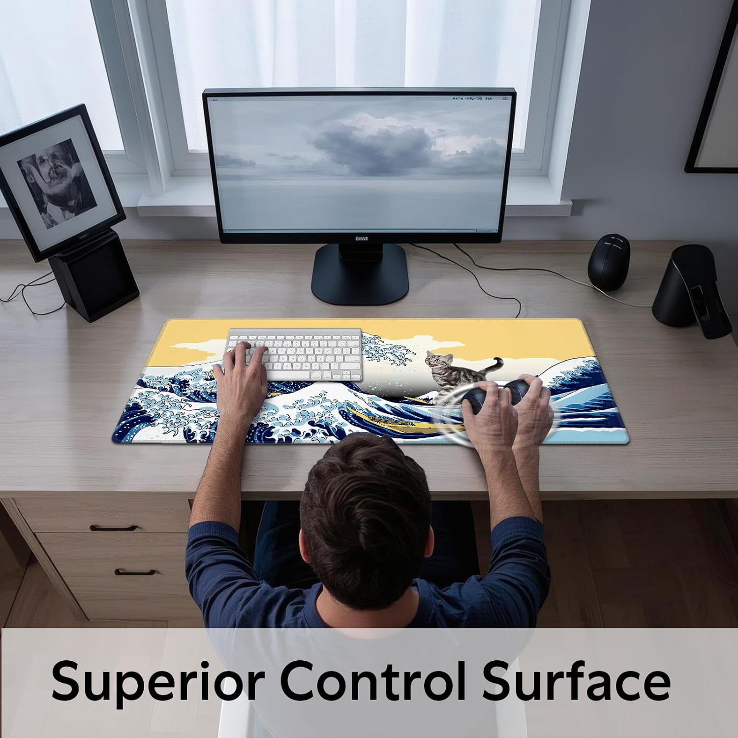 Funny Cat Surfing The Great Wave Off Kanagawa Mouse Pad - Large Non-Slip Desk Mat for Office, PC, Laptop - 31.5"x11.8" x 3mm