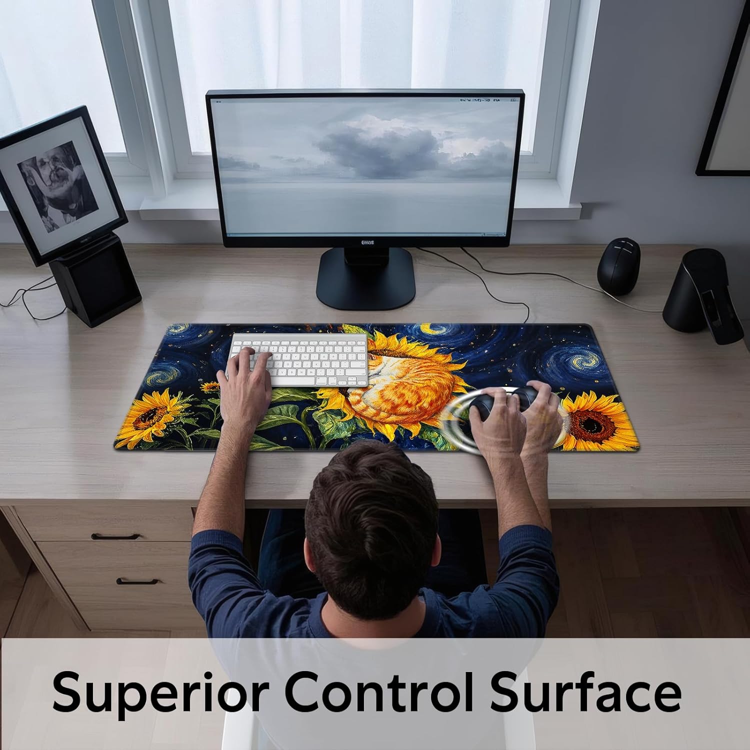 Sunflower Cat Gaming Mouse Pad, Starry Sky Cute Orange Cat Mousepad - Large Non-Slip Desk Mat for Office, PC, Laptop - 31.5"x11.8" x 3mm
