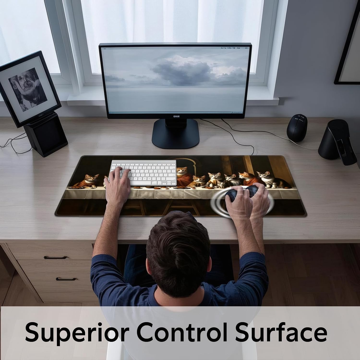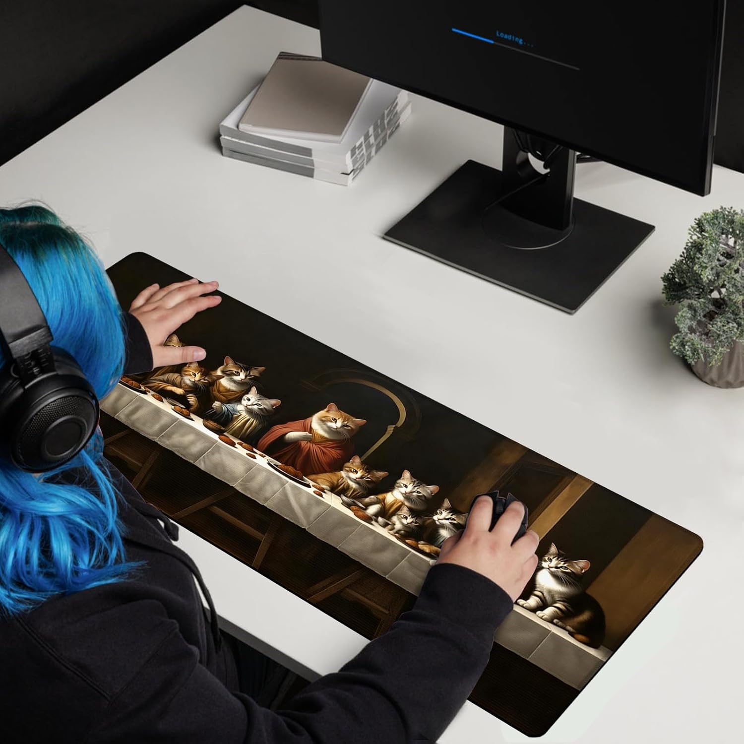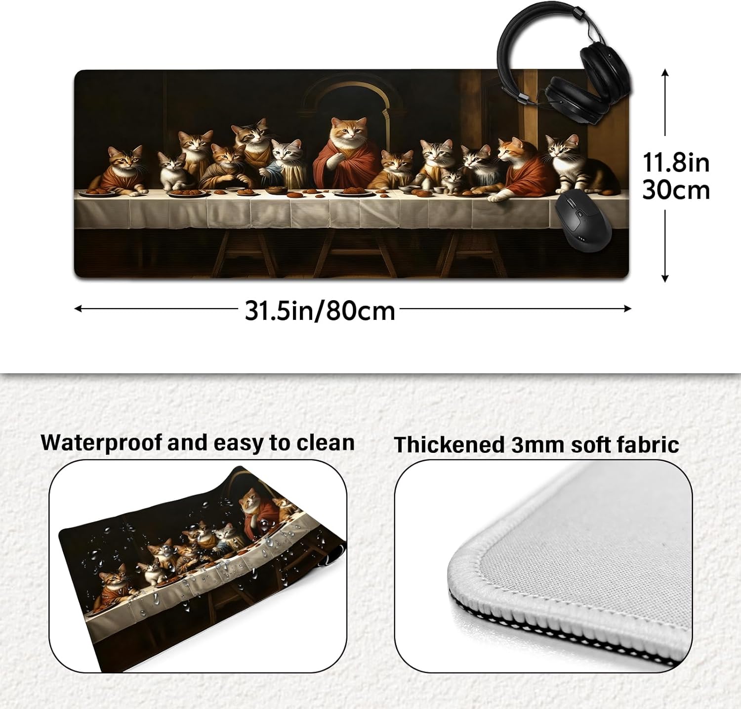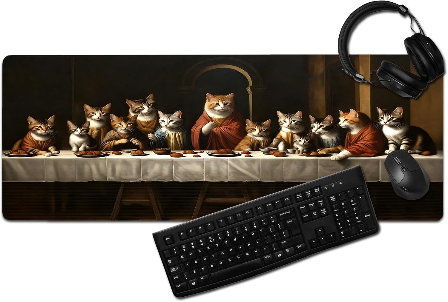 Artistic Cat Last Supper Mouse Pad, Adorable Cats in Religious Scenario Mousepad - Large Non-Slip Desk Mat for Office, PC, Laptop - 31.5"x11.8" x 3mm