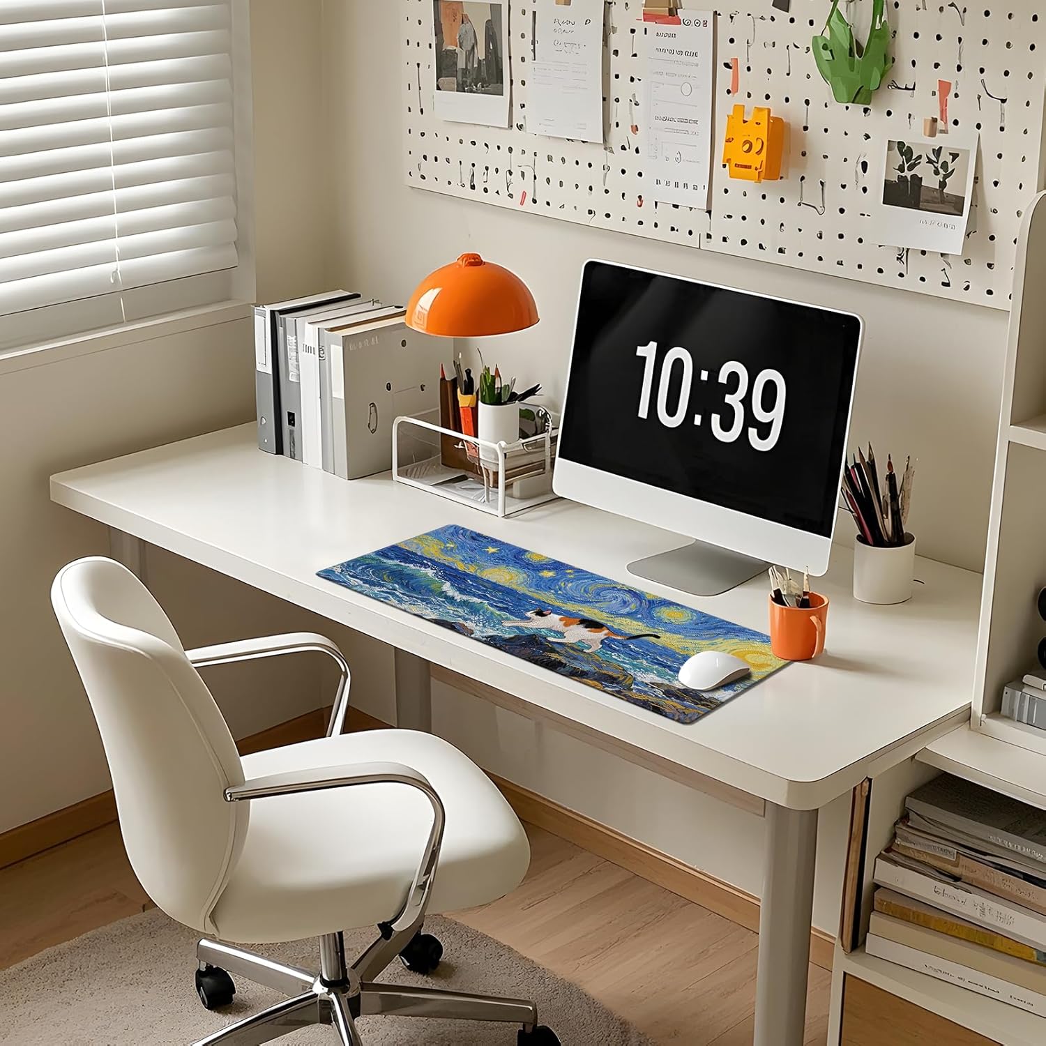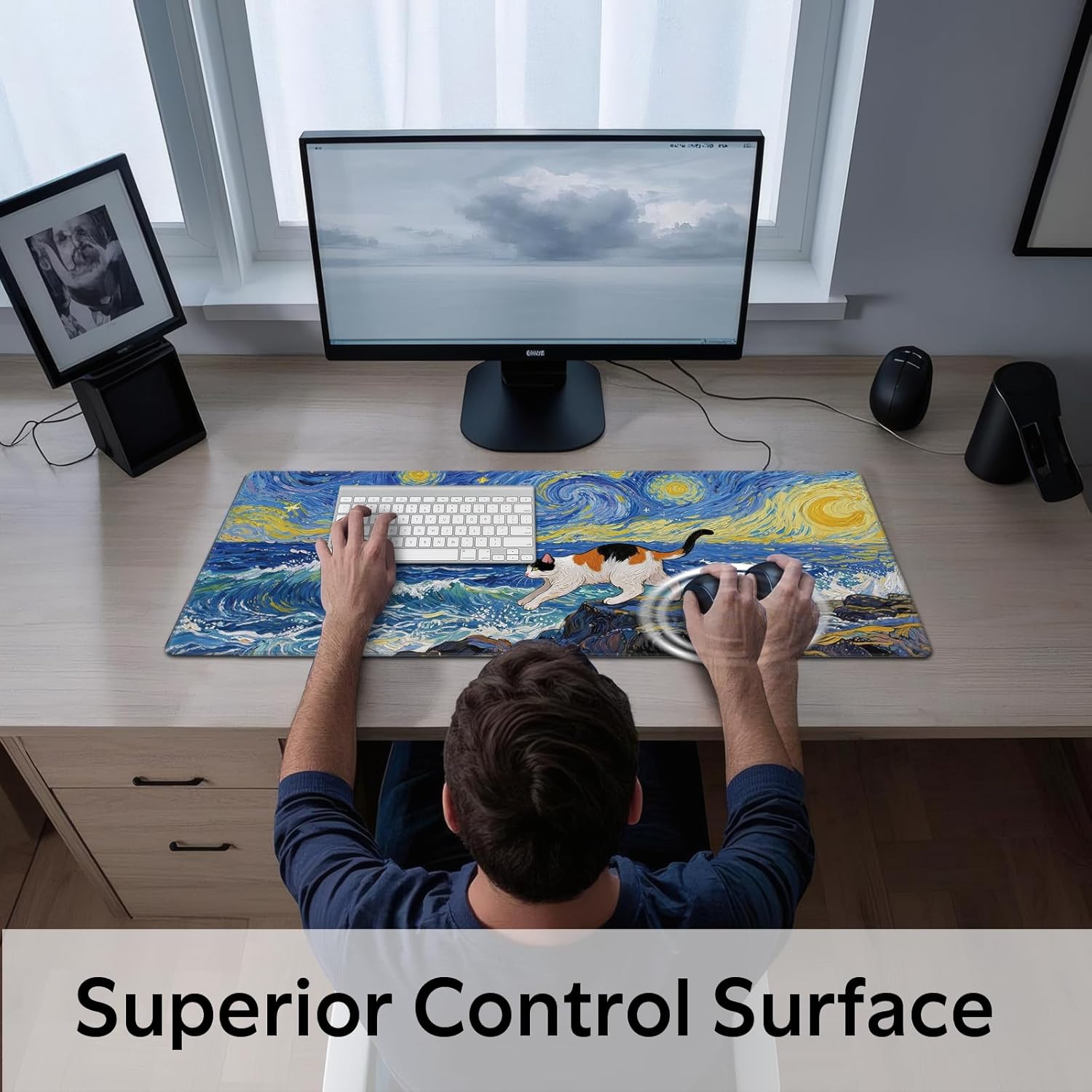 Cute Calico Cat Surfing Mouse Pad, Starry Night Style Mousepad - Large Non-Slip Desk Mat for Office, PC, Laptop - 31.5"x11.8" x 3mm